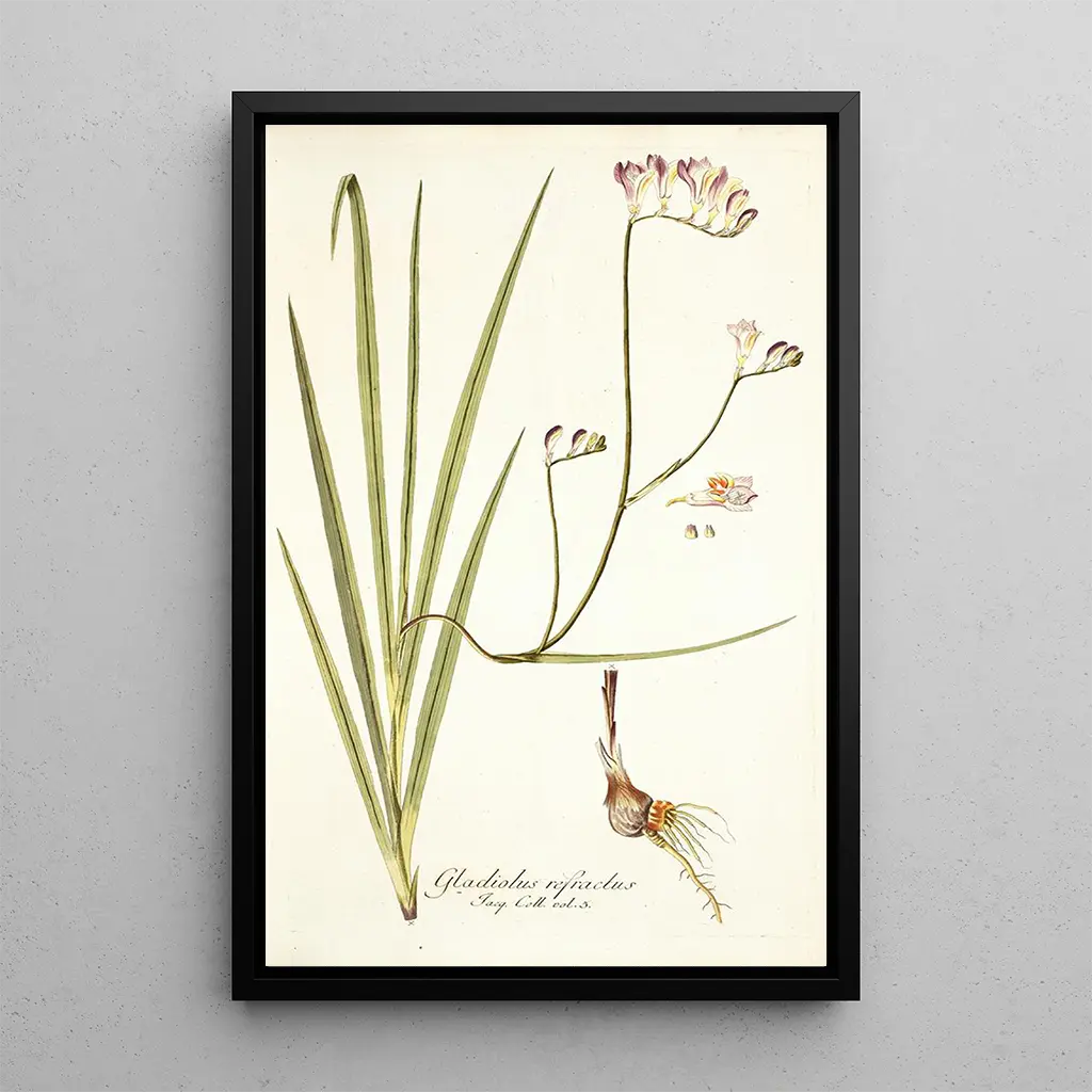Nikolaus Joseph Freiherr von Jacquin, botanist och konstnär från 1700-talet, lyckades förena vetenskap och konst i sina skapelser. Utbildad vid Wiens universitet, reste han genom Europa och Västindien, inspirerad av exotiska landskap och växter han upptäckte. Hans konsttryck "Gladiolus refractus" tillhör en period då den vetenskapliga observationen av växter var i full blom, och Jacquin lyckades fånga denna essens genom sin konst. Hans botaniska illustrationer är inte bara konstverk, utan också värdefulla vetenskapliga dokument, som vittnar om naturens betydelse i hans tids kultur.