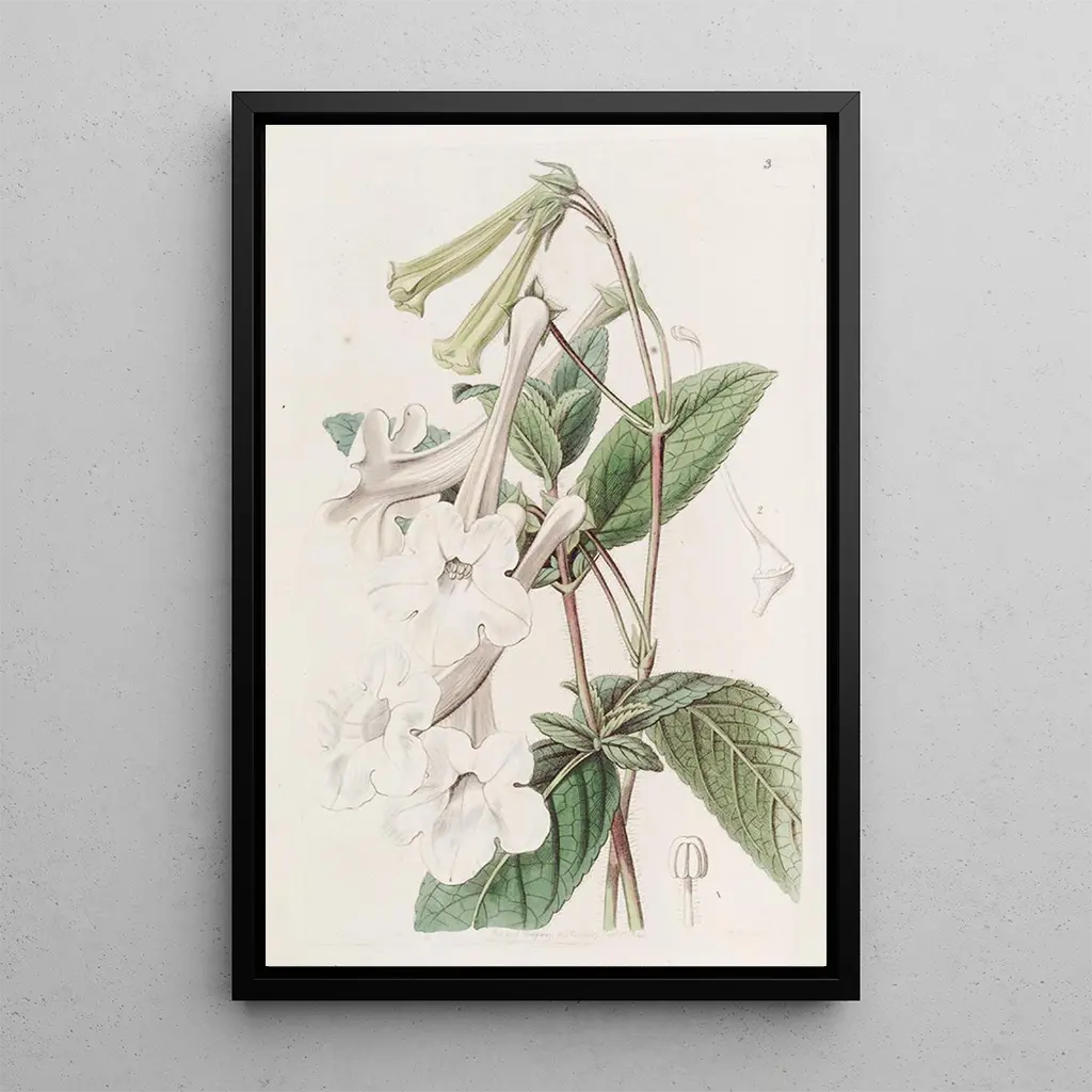 Konsttrycket av verket "Gloxinia med tubulära blommor" av Sydenham Edwards fördjupar oss i en livfull blomstervärld. De strålande nyanserna av lila, rosa och vitt blandas harmoniskt och skapar en atmosfär som är både glad och lugnande. Akvarelltekniken, använd med fin precision, fångar blommornas ömtålighet och skuggornas djup. Varje detalj, från bladnervor till ljusreflexer på blommorna, vittnar om en noggrann observation av naturen. Detta konsttryck inbjuder till eftertanke och erbjuder ett ögonblick av flykt i en frodig trädgård.