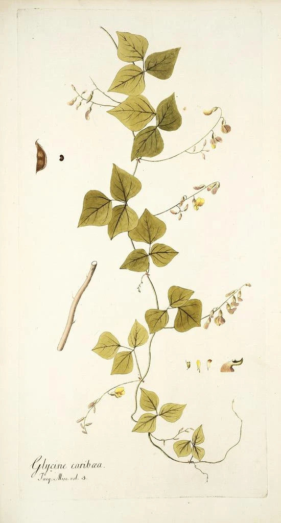 Nikolaus Joseph Freiherr von Jacquin, botanist och konstnär från 1700-talet, spelade en avgörande roll i studiet av exotiska växter. Hans resor till Sydamerika gjorde det möjligt för honom att upptäcka sällsynta arter, inklusive Glycine caribaea, som han avbildade med en anmärkningsvärt noggrann precision. Påverkad av den vetenskapliga och konstnärliga rörelsen under sin tid, lyckades Jacquin kombinera vetenskaplig noggrannhet med konstnärlig känslighet. Hans verk vittnar om en djup respekt för naturen och en vilja att göra den känd för världen, vilket markerar en vändpunkt i botaniken.