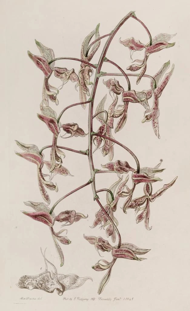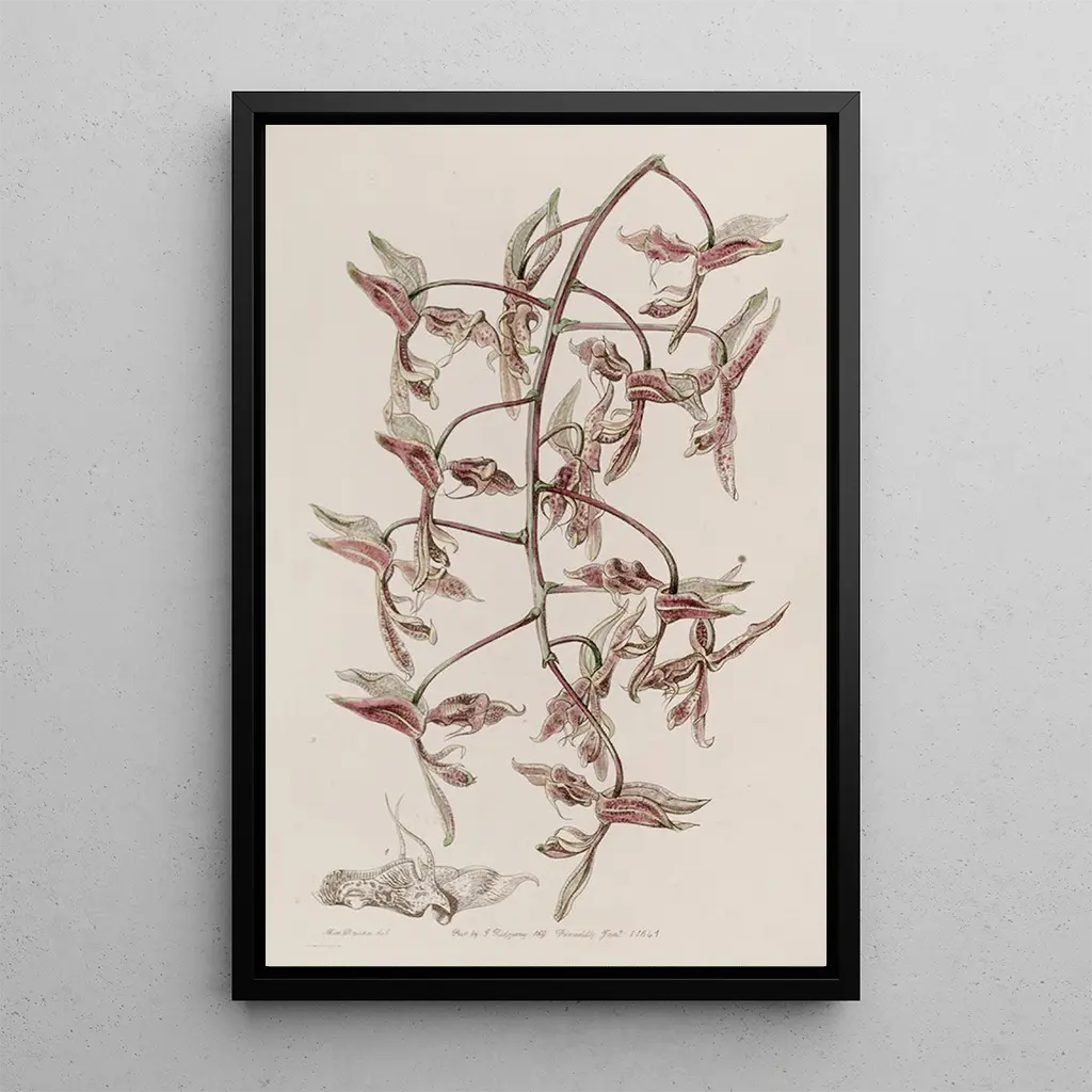 Det konsttryck "Gongora med tofs av padda" av Sydenham Edwards är en fascinerande skildring av en sällsynt orkidé. De minutiösa detaljerna i blommorna, med sina rika nyanser och exotiska former, fångar betraktarens uppmärksamhet. Kompositionen framhäver den unika texturen hos kronbladen, som påminner om en paddas hud, därav namnet på arten. Tekniken med akvarell gör det möjligt att återge ljusheten och ömtåligheten hos denna växt, vilket skapar en atmosfär som är både mystisk och förtrollande. Detta konsttryck inbjuder till upptäckten av en ofta okänd växtvärld.