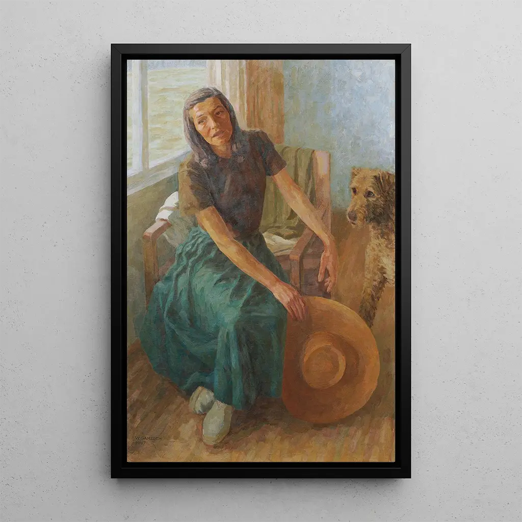 Konsttrycket "Grete Gamerith med hunden Puck" av Walther Gamerith är en rörande skildring av kärleken mellan en kvinna och hennes fyrbente följeslagare. De livfulla färgerna och de noggranna detaljerna i scenen framkallar en atmosfär av värme och gemytlighet. Tekniken med olja på duk ger konstnären möjlighet att leka med ljus och skugga, vilket framhäver de mjuka dragen hos Grete och Pucks livfullhet. Detta konsttryck fångar ett enkelt lyckorus, inbjuder betraktaren att känna glädjen och samhörigheten som strålar från denna relation.