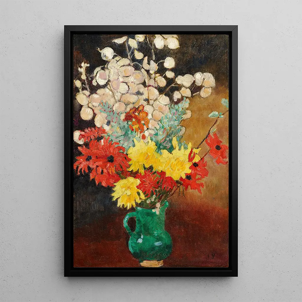 I "Cruche verte dahlias et fleurs" bjuder Louis Valtat på en blomsterkomposition med stor visuell rikedom. Krukan, i en strålande grön nyans, fungerar som en bakgrund för en frodig bukett av dahlior och andra färgglada blommor. De livfulla nyanserna och de organiska formerna blandas harmoniskt, vilket skapar en glad och livlig atmosfär. Valtats teknik, kännetecknad av snabba och uttrycksfulla penseldrag, ger liv åt varje blomblad och blad, vilket gör verket nästan taktilt. Detta konsttryck framkallar naturens flyktiga skönhet, samtidigt som det hyllar konstnärens virtuositet.