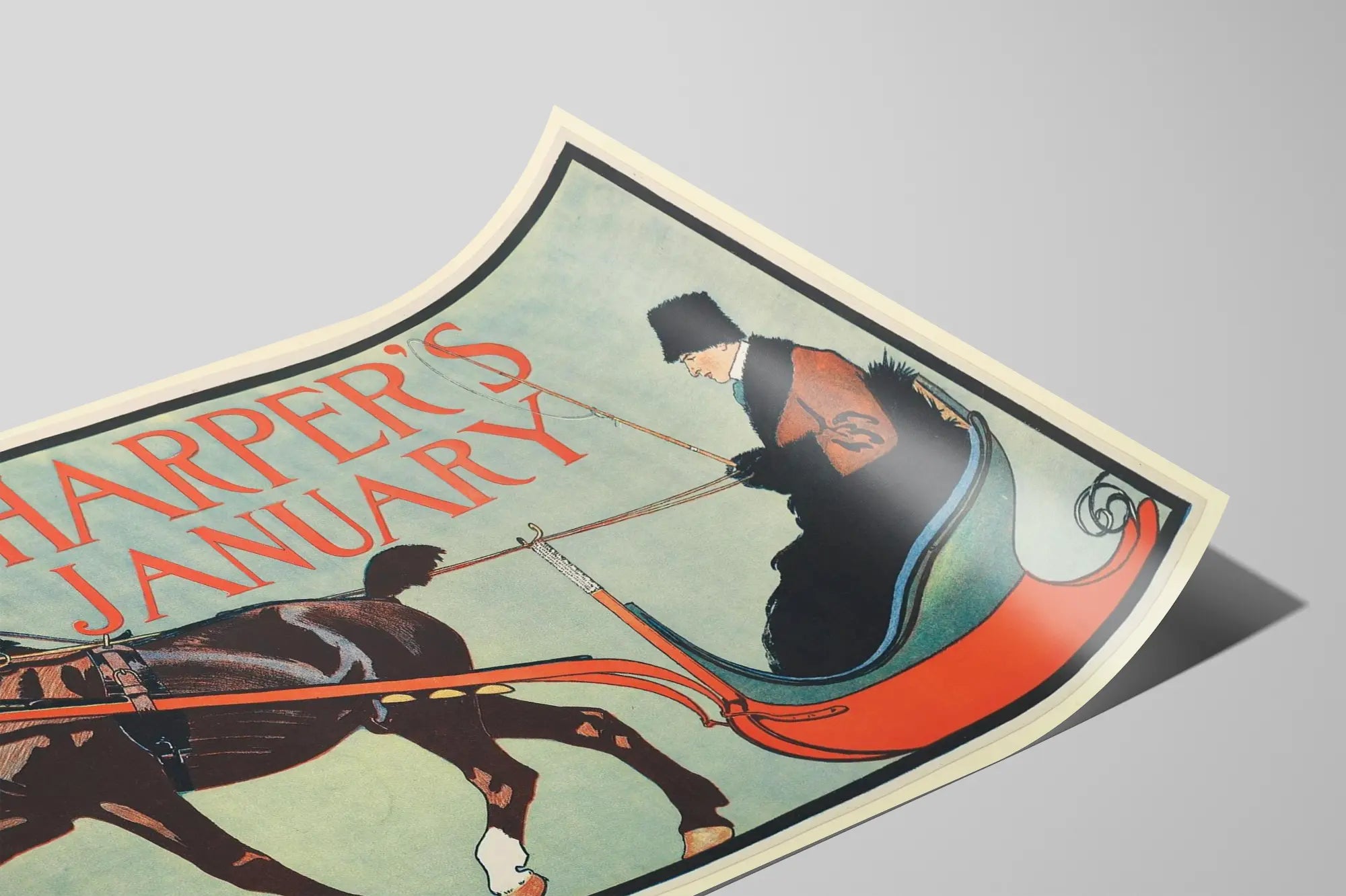 Cette affiche vintage intitulée "Harper's January" représente une scène hivernale élégante avec un cheval brun attelé à un traîneau rouge. À bord, une personne vêtue de vêtements d'hiver classiques, dont un manteau et un chapeau en fourrure, tient les rênes du cheval avec une posture sereine et confiante. Le fond de l'affiche est d'un bleu pâle qui contraste agréablement avec les tons chauds du cheval et du traîneau. Le texte "Harper's January" est inscrit en lettres rouges imposantes, ajoutant une touche graphique forte à cette décoration murale. Ce poster est idéal pour apporter une ambiance rétro et élégante dans un intérieur, notamment pour ceux qui apprécient les illustrations d'époque et les scènes hivernales traditionnelles. Ce type d'affiche peut s'intégrer harmonieusement dans une décoration murale vintage, dans un salon ou une bibliothèque, apportant un charme intemporel et une touche d'histoire. L'image souligne le raffinement et la simplicité d'une époque passée, évoquant les plaisirs simples des promenades en traîneau dans la neige. Ce poster décoratif se prête aussi bien à un cadre classique qu'à une présentation plus moderne, selon le style recherché. Parfait pour les amateurs de décoration murale à thème saisonnier, il invite à une ambiance cosy et nostalgique. Il peut également compléter une collection d'affiches artistiques ou historiques pour créer un mur d'exposition unique et personnel. En résumé, cette affiche Harper's January propose un visuel captivant et chaleureux, idéal pour enrichir un espace intérieur avec une touche décorative raffinée et vintage.