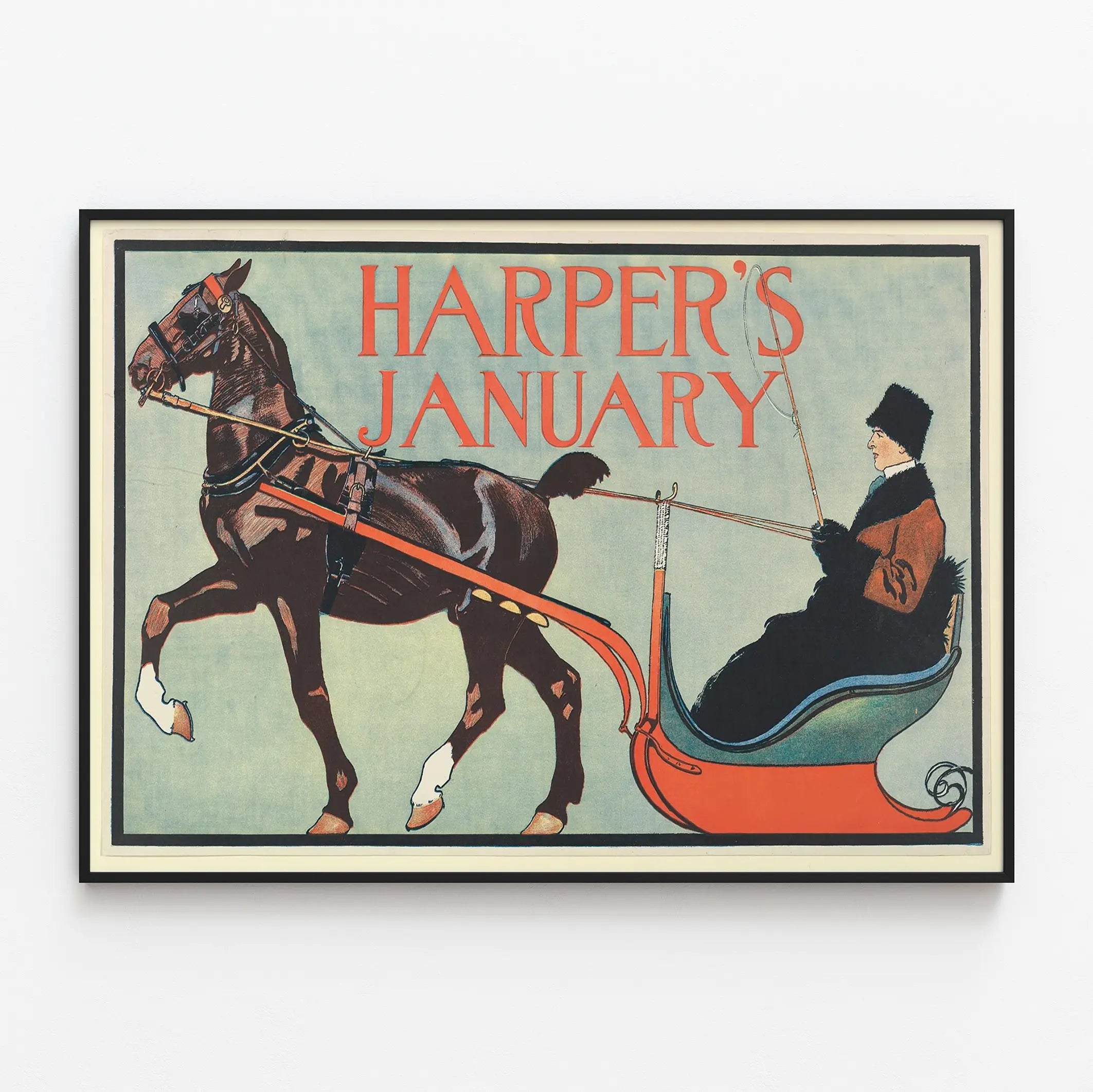 Affiche vintage Harper's January avec cheval et traîneau