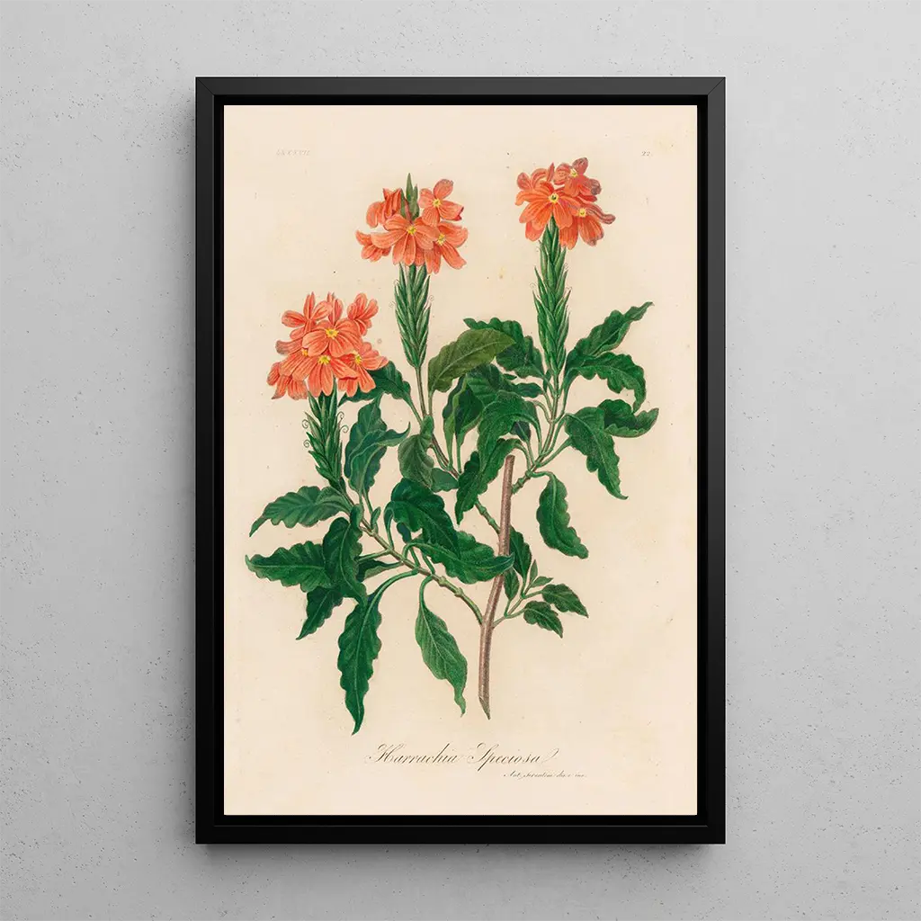 Konsttrycket av Harrachia speciosa förflyttar oss till en frodig trädgård där blommorna blommar i en symfoni av ljusa färger. Detta verk, utfört med en finstämd teknik, lyfter fram skönheten i de exotiska blomsters former och texturer. De livfulla nyanserna av rosa och lila, kombinerade med gröna inslag, skapar en glad och dynamisk atmosfär. Varje detalj är noggrant återgiven, inbjudande betraktaren att fördjupa sig i denna blomstrande värld där naturen uttrycker sig i all sin prakt.