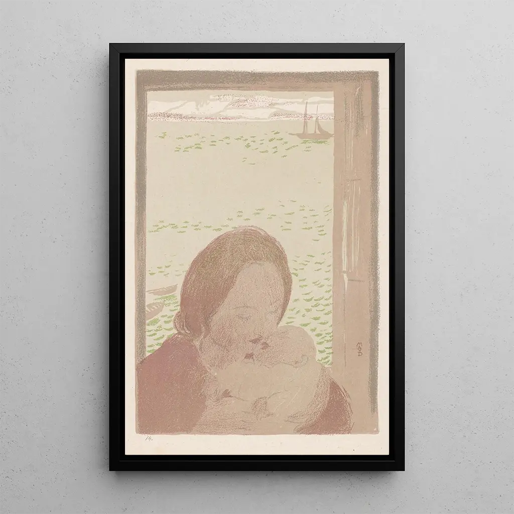 I "Mamma med barn vid havet" skildrar Maurice Denis en scen som är fylld av ömhet och mildhet, där en mamma vakar över sitt barn, båda badande i det gyllene ljuset från solnedgången. Nyansen av blått och sand framkallar havets lugn, medan de runda och mjuka formerna på figurerna skapar en atmosfär av värme och skydd. Denis teknik, som förenar impressionism och symbolism, gör det möjligt att känna den rena känslan som strålar ut från denna interaktion, vilket gör detta konsttryck till en verklig hyllning till moderskapet.