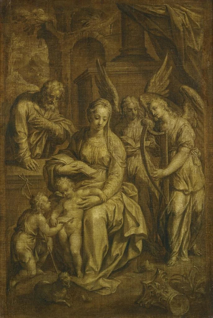 Sainte Familj med änglar: en scen av gudomlig ömhet