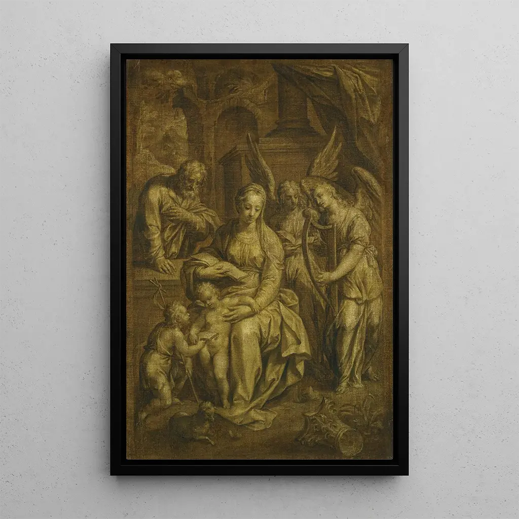 Konsttrycket av den heliga familjen med änglar framkallar en atmosfär av lugn och mildhet. Personerna är varsamt placerade, vilket skapar en harmonisk komposition där ljuset spelar en avgörande roll. Pastellfärger, som blandar varma och lugnande nyanser, sveper in scenen i en aura av fred. Olje-målningstekniken, som är karakteristisk för perioden, möjliggör fångst av ansiktsdetaljer och draperingar med en anmärkningsvärt precision. Varje element, från änglarna med sina välvilliga uttryck, bidrar till en inbjudan till andlig eftertanke.