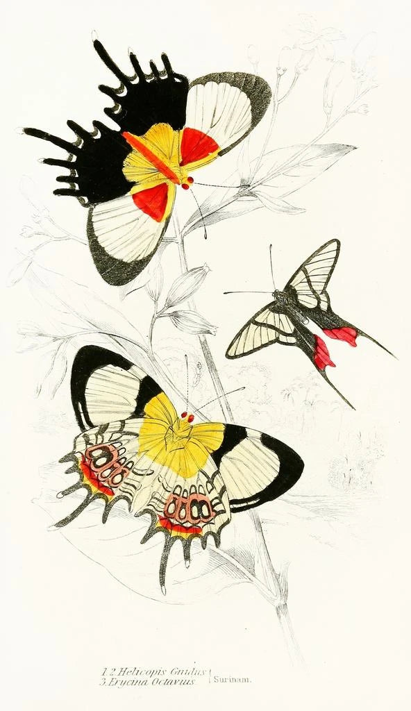 Helicopis Gnidus Erycina Octavius är ett konsttryck som väcker känslan av naturens ömtålighet och komplexitet. James Duncan skildrar med fin precision de skimrande nyanserna på denna fjärils vingar, i kontrast till de mjuka blommorna som omger den. Pastellfärgerna flätar samman för att skapa en lugn och drömlik atmosfär, inbjudande till en visuell utforskning. Akvarelltekniken, som används med mästerskap, ger denna målning en lätthet och transparens som fångar själva essensen av naturens flyktiga skönhet. Varje penseldrag verkar berätta en historia, den om ett ögonblick som är hängivet i tiden.