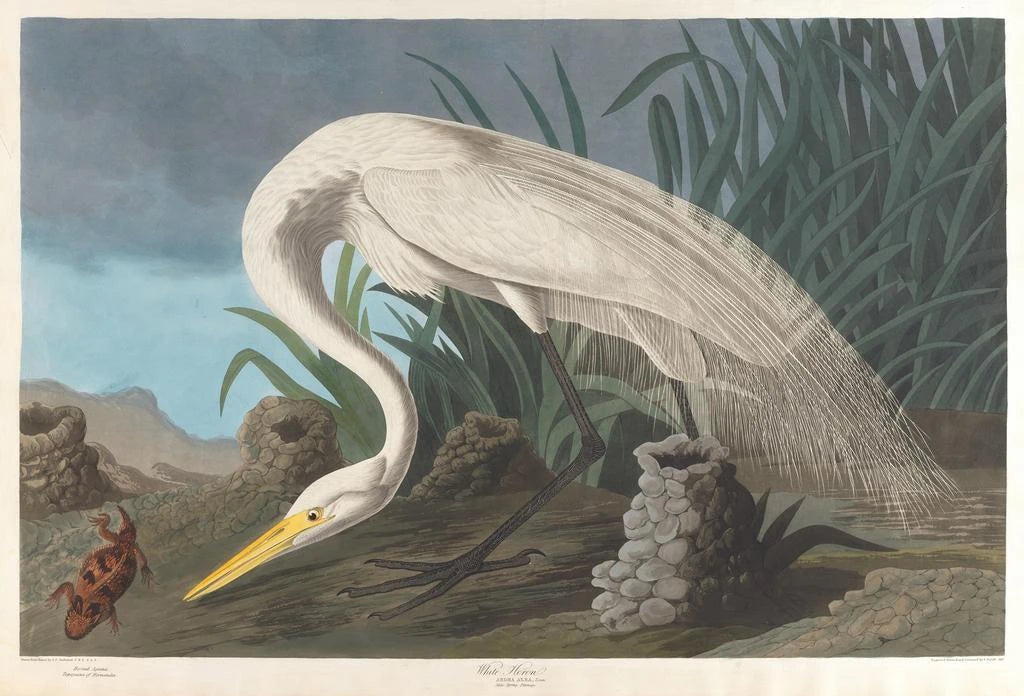 Le tableau "Héron blanc" de John James Audubon capture la grâce et la beauté de cet oiseau emblématique dans un cadre naturel. Les nuances de blanc et de bleu se mêlent harmonieusement, créant une atmosphère sereine et contemplative. Audubon, connu pour sa précision ornithologique, utilise des techniques de peinture à l'aquarelle qui mettent en valeur les détails délicats des plumes et la posture élégante du héron. L'œuvre dégage une impression de tranquillité, invitant le spectateur à apprécier la majesté de la faune sauvage dans son habitat naturel.