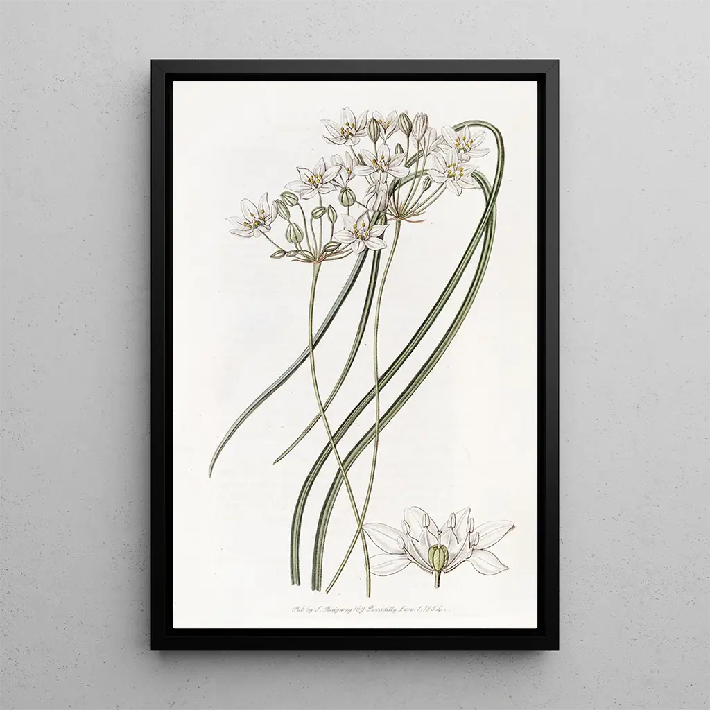Konsttrycket Hespéroscordum blanc laiteux, skapat av Sydenham Edwards, framstår som ett fint akvarellverk där ljuset leker med nyanser av vitt och grönt. Blommornas kronblad, nästan genomskinliga, tycks fånga morgonens dimmiga mjukhet, medan de eleganta stjälkarna för tankarna till vilda växters grace. Atmosfären som genomsyrar denna målning är fylld av lugn, inbjudande betraktaren att fördjupa sig i en rofylld blomstervärld. Akvarelltekniken möjliggör en finstämd återgivning av bladens och blommornas detaljer, vilket skapar en harmonisk visuell upplevelse som förtrollar och förflyttar betraktaren.