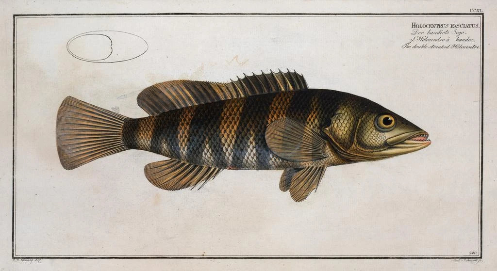 Marcus Elieser Bloch, naturaliste et artiste du XVIIIe siècle, est célèbre pour ses contributions à l'ichtyologie, la science des poissons. Ses œuvres, dont le Holocentrus fasciatus, sont non seulement des illustrations scientifiques, mais aussi des pièces d'art remarquables. Bloch a voyagé à travers l'Europe et a étudié diverses espèces marines, ce qui lui a permis de créer des représentations précises et artistiques de la faune aquatique. Son travail a eu un impact durable sur la manière dont les poissons sont perçus dans l'art et la science, faisant de lui une figure incontournable dans l'histoire de l'art naturaliste.