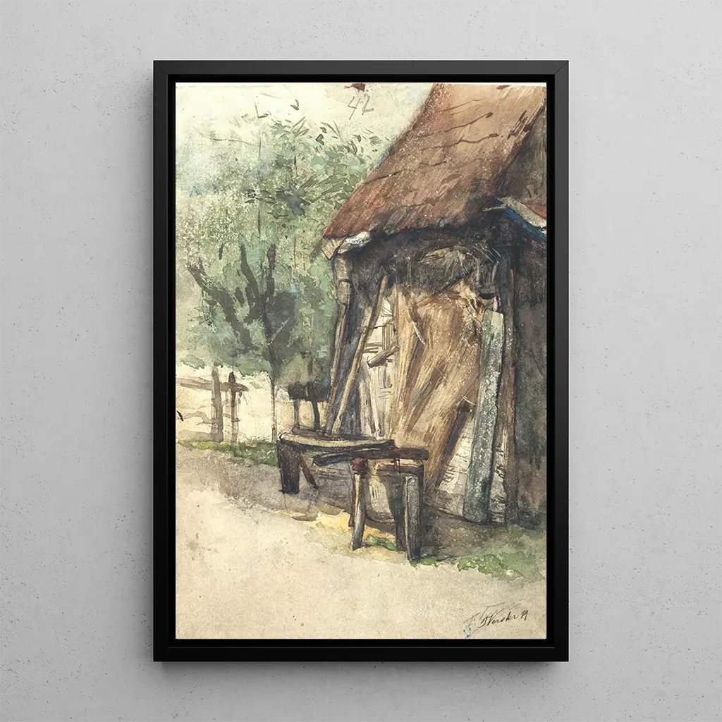 Floris Versters grådgård med arbetsbänk är ett konsttryck som väcker känslan av lugn i det holländska landskapet. Detta konsttryck skildrar en idyllisk scen, där ladan, med sina jordnära nyanser och mjuka skuggor, smälter harmoniskt in i den omgivande naturen. Ljuset spelar en avgörande roll, belyser detaljerna i strukturen och skapar en varm atmosfär. Versterns teknik, som kombinerar realism och impressionistiska inslag, gör det möjligt att känna texturen av trä och den lantliga livets stillhet. Detta konsttryck inbjuder till en flykt till enklare tider, där naturen och människan lever i harmoni.