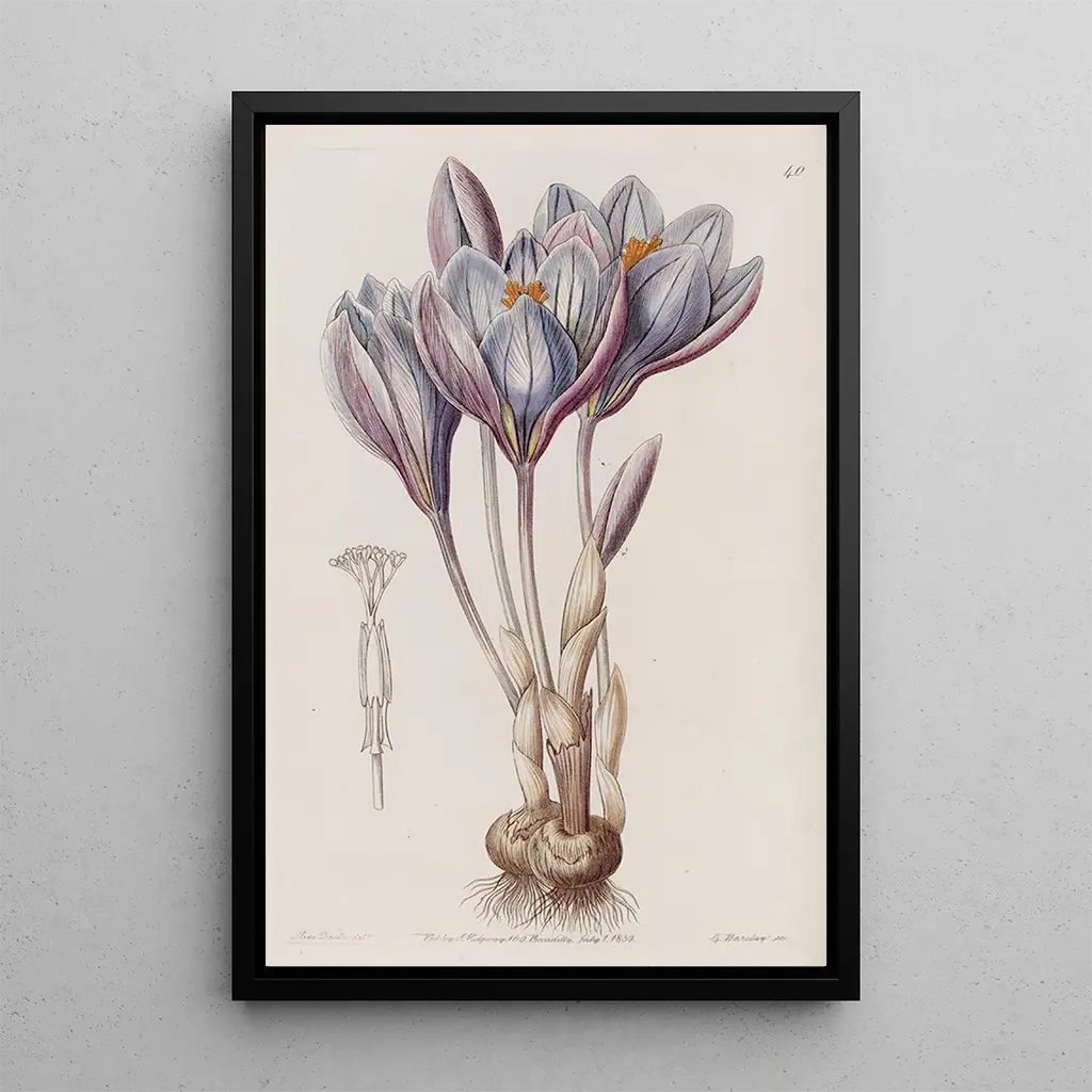 Det brinnande höstkonsttrycket av Sydenham Edwards framkallar magin i höstlandskap. Detta konsttryck framhäver den delikata skönheten hos höstliljorna, med sina nyanser av lila och vitt som lyser upp bilden. Akvarelltekniken gör det möjligt att fånga genomskinligheten hos blombladen och rikedomarna i skuggorna, vilket skapar en mjuk och melankolisk atmosfär. Varje detalj är noggrant återgiven, inbjudande betraktaren att uppskatta den flyktiga skönheten hos dessa blommor som signalerar slutet på sommaren. Detta konsttryck är en sann inbjudan till reflektion och förundran inför naturen.