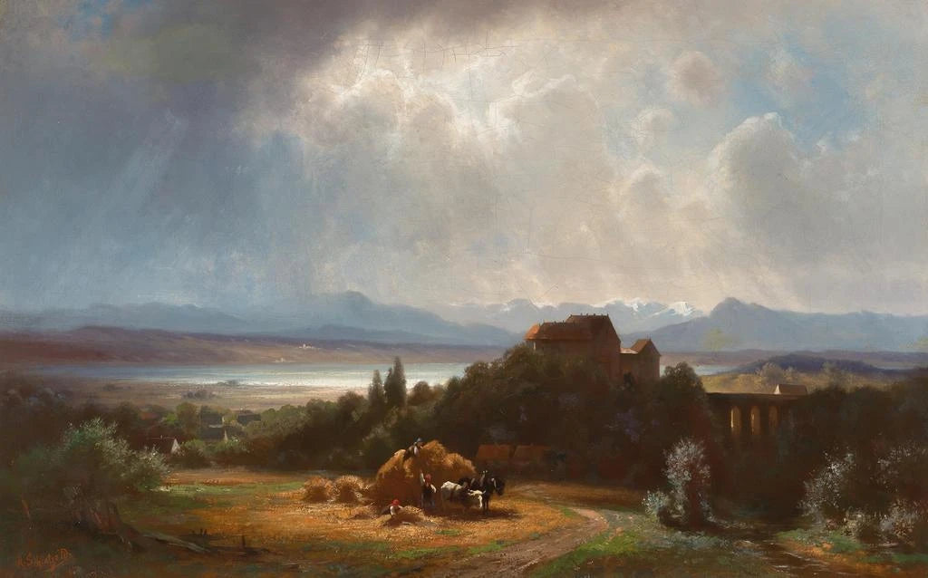 "À la récolte de foin" est une œuvre vibrante qui illustre le travail acharné des agriculteurs au cœur de la nature. Les couleurs chaudes, allant des jaunes dorés aux verts éclatants, évoquent la richesse des champs en été. La composition dynamique, avec des personnages en pleine action, transmet une énergie palpable, presque contagieuse. La technique de l'huile sur toile permet de rendre les détails des outils agricoles et des vêtements des travailleurs avec une grande précision, créant ainsi une scène vivante qui célèbre le lien entre l'homme et la terre.