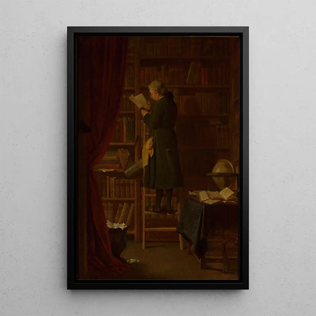 Konsttrycket "I biblioteket" av Georg Reimer förflyttar betraktaren till en värld av kunskap och eftertanke. Detta verk skildrar en intim scen, där böcker med gamla bindningar står uppradade på trähyllor, vilket skapar en varm och studiefokuserad atmosfär. De varma färgerna och ljusspel betonar det välkomnande karaktären hos detta utrymme, inbjudande till läsning och reflektion. Den noggrant arrangerade kompositionen, med detaljerade inslag, gör detta konsttryck till en sann hyllning till litteraturens passion och bibliotekets konst.