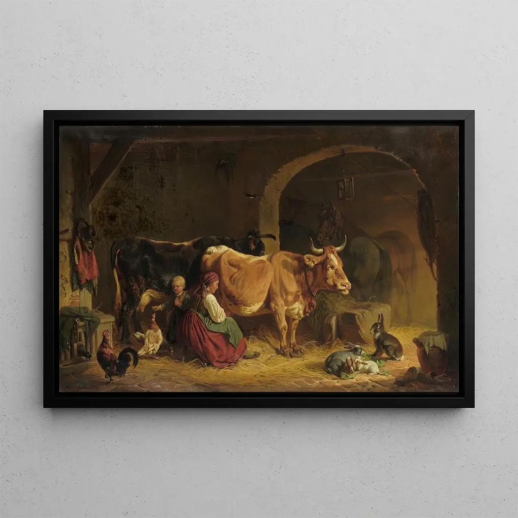 I den gamla ladan: en scen av lantliv präglad av lugn. "Den gamla ladan" är ett konsttryck som fångar enkelheten och skönheten i lantlivet. Kompositionen framhäver figurer engagerade i vardagliga aktiviteter, omgivna av en fridfull och varm atmosfär. Jordnära nyanser och ljusspel skapar en intim stämning, som bjuder in betraktaren att fördjupa sig i detta ögonblick av stillhet. Konstnärens teknik, som prioriterar detaljer och textur, hyllar det enkla livet, samtidigt som den väcker en mild nostalgi för en svunnen tid. Jean-François Millet: landsbygdens målare. Jean-François Millet, en ikonisk figur inom den realistiska rörelsen under 1800-talet, är berömd för sina skildringar av lantlivet. Påverkad av sin egen landsbygd, lyckades Millet ge röst åt jordens arbetare, och fånga deras värdighet och slit genom kraftfulla konstverk. "Den gamla ladan" illustrerar perfekt hans engagemang för en äkta skildring av bönderna, samtidigt som den lyfter fram deras vardags skönhet. Hans stil, kännetecknad av solida former och naturliga färger, har haft ett bestående inflytande på modern konst. En dekorativ konsttryck med många fördelar. Konsttrycket av "Den gamla ladan" är ett utmärkt val för att försköna ditt hem, oavsett om det är i ett vardagsrum, kök eller kontor. Dess tryckkvalitet garanterar en enastående trohet mot nyanserna i originalverket, och tillför en värmande och inbjudande atmosfär till ditt utrymme. Denna tavla, med sin rustika charm, passar perfekt i olika inredningsstilar, från klassiskt till modernt. Skäm bort dig själv med detta konsttryck för att berika din omgivning med ett konstverk som hyllar skönheten i ett enkelt och äkta liv.