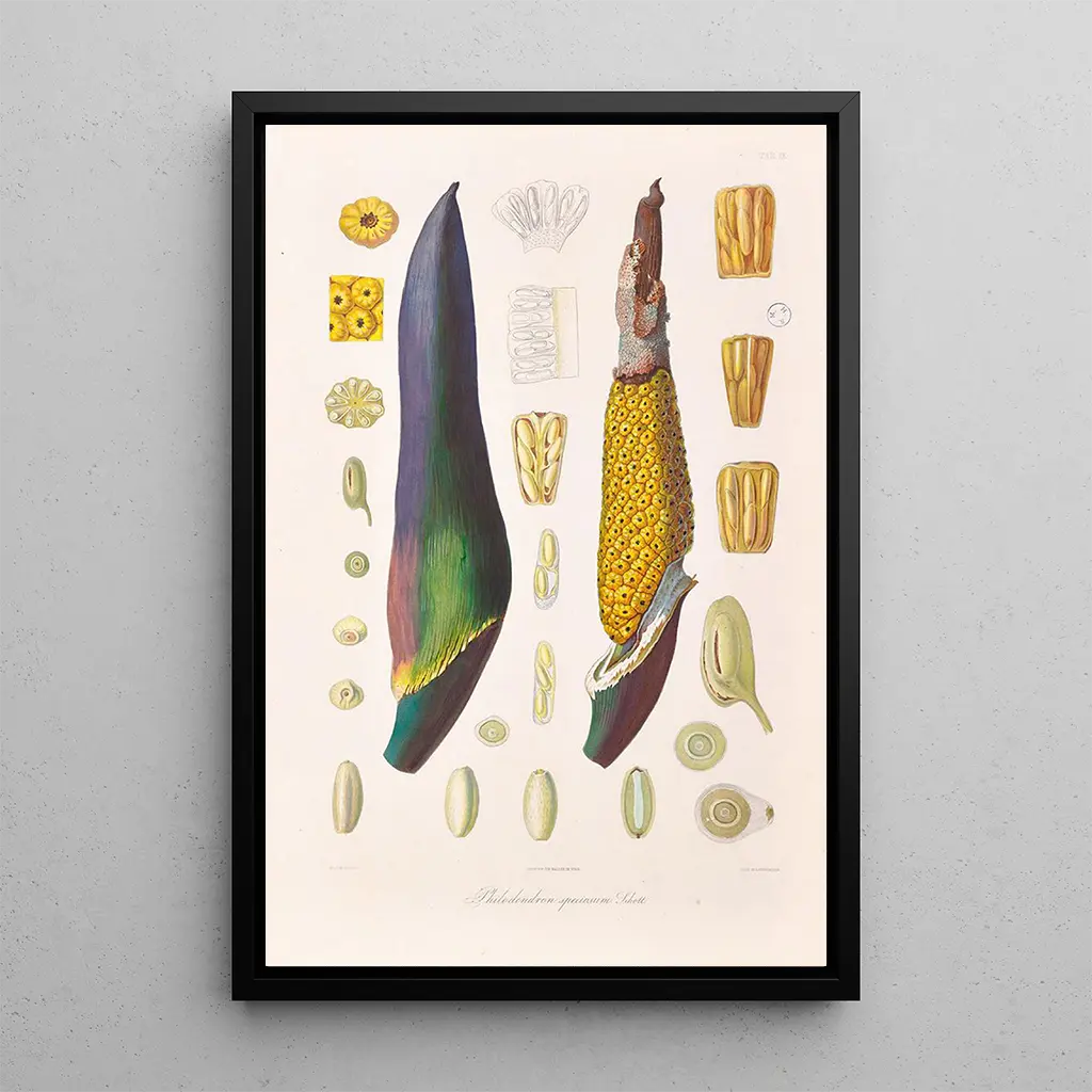 Konsttrycket av Icones Aroidearum Pl09 tar oss till en frodig värld där varje växt lyfts fram med enastående precision. Denna tavla, skapad med en förfinad graveringsteknik, visar en palett av livfulla färger som framkallar värmen från tropikerna. Nyansen av grönt, rosa och blått blandas harmoniskt och skapar en levande och dynamisk atmosfär. Verket inbjuder till utforskning av former och texturer hos aroides, och avslöjar komplexiteten och skönheten hos dessa fascinerande växter, samtidigt som det erbjuder en fängslande visuell upplevelse.