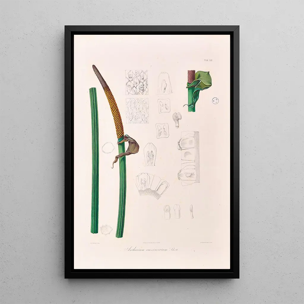 "Icones Aroidearum Pl13" av Heinrich Wilhelm Schott är ett verk som fördjupar betraktarens förtjusning i den fascinerande världen av araceae. Med en palett av livfulla färger och detaljer med slående precision lyckas Schott fånga varje arts unika skönhet. De organiska formerna och de delikata texturerna av blad och blommor framhävs, vilket skapar en atmosfär som är både dynamisk och lugn. Detta konsttryck är mycket mer än en enkel botanisk avbildning; det väcker en djup koppling till naturen och inbjuder till förundran.