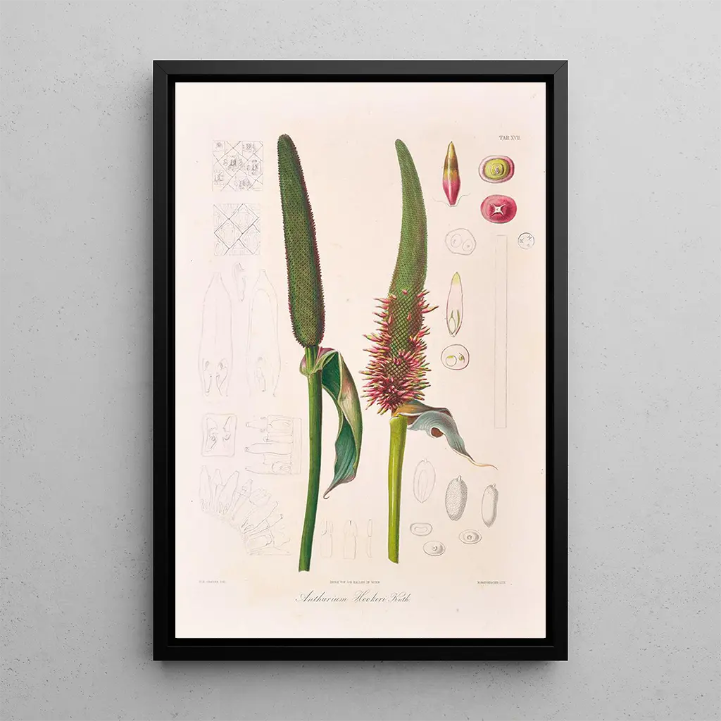 "Icones Aroidearum Pl17" av Heinrich Wilhelm Schott är ett konsttryck som hyllar rikedom och mångfald av Aroidväxter. Med sina noggranna detaljer och sina livfulla färger förflyttar denna botaniska illustration betraktaren till en frodig värld. Skiftningarna av grönt, rosa och vitt blandas harmoniskt och skapar en atmosfär som är både lugnande och upplyftande. Akvarelltekniken, kombinerad med ett precist streck, hyllar växternas naturliga skönhet samtidigt som den erbjuder en konstnärlig tolkning av den tropiska floran.