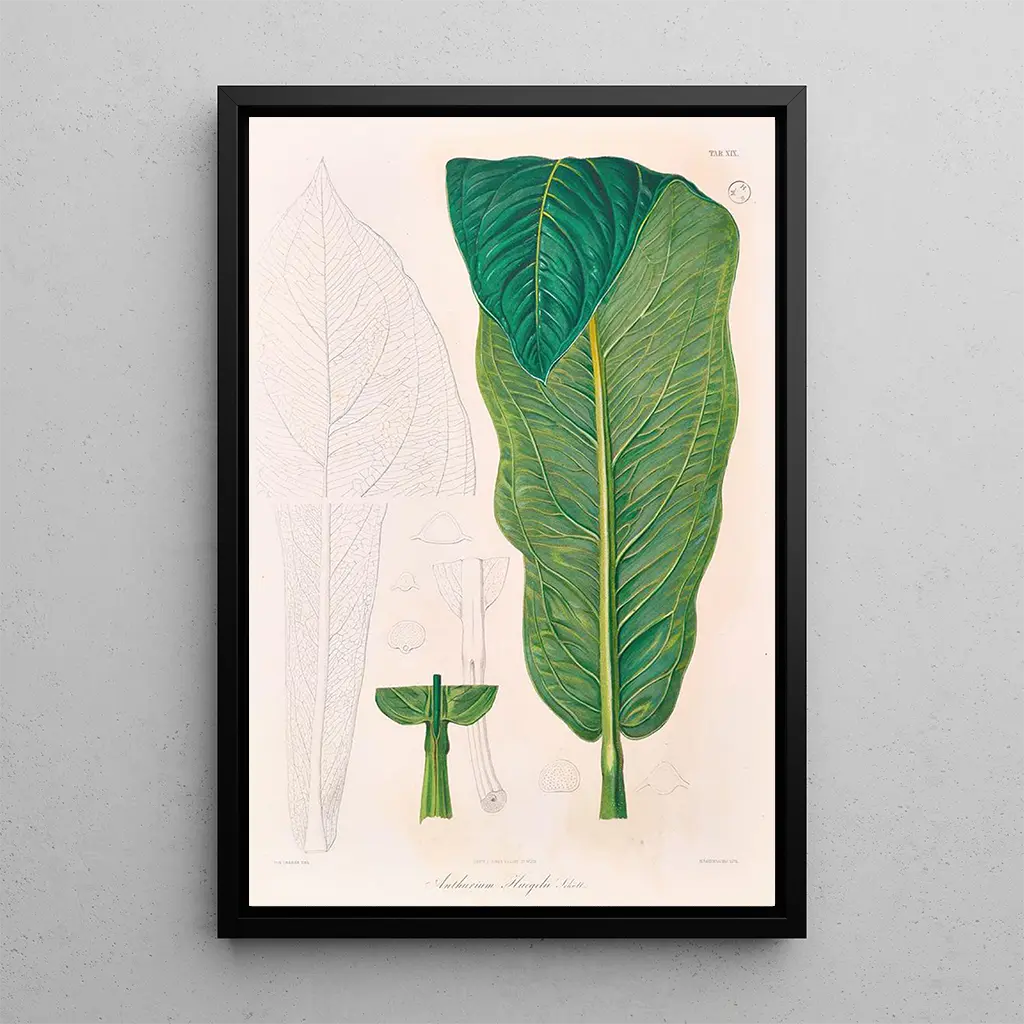 Detta konsttryck av Icones Aroidearum Pl19 är ett perfekt dekorativt föremål för alla interiörer, oavsett om det är ett vardagsrum, ett kontor eller ett sovrum. Dess tryckkvalitet och trohet mot de ursprungliga färgerna gör det till ett fängslande konstverk som fångar blickar. Genom att integrera detta konsttryck i din inredning tillför du en touch av natur och elegans till ditt utrymme. Den estetiska attraktionen i detta verk ligger i dess förmåga att framkalla en känsla av lugn samtidigt som det visuellt berikar din omgivning. Det är ett inköp som kommer att tilltala konst- och botanikkännare, samtidigt som det ger en frisk fläkt till din inredning.