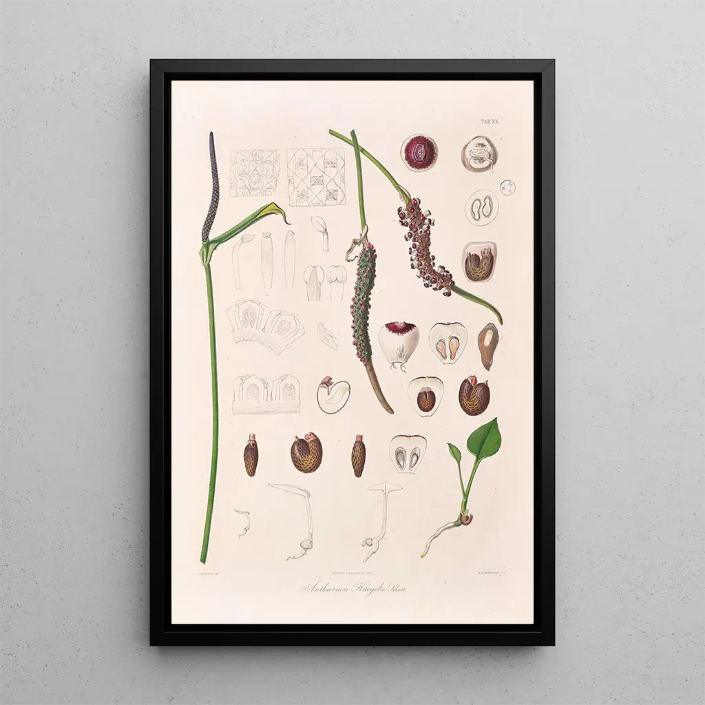 Konsttrycket av Icones Aroidearum Pl20 för oss in i en frodig värld där växtmångfalden lyfts fram med glans. Varje detalj, från bladnervatur till blomfärger, är noggrant återgiven, vilket vittnar om Heinrich Wilhelm Schotts expertis. De livfulla färgerna och den harmoniska kompositionen skapar en levande och dynamisk atmosfär, som bjuder in betraktaren att uppskatta naturens skönhet. Detta verk, utfört med en finstämd akvarellteknik, framkallar en känsla av lätthet och ömtålighet, och fångar själva essensen av naturen i all sin prakt.