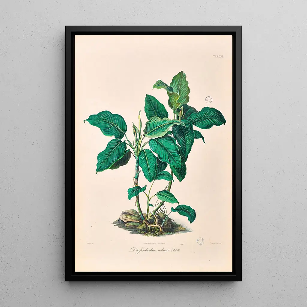 L'œuvre "Icones Aroidearum Pl21" av Heinrich Wilhelm Schott är en verklig hyllning till växternas mångfald. Denna botaniska illustration, utförd med en anmärkningsvärt noggrann detaljrikedom, framhäver de minutiösa detaljerna i blad och blommor, och avslöjar naturens gömda skönhet. De livfulla färgerna, från djupa gröna till delikata nyanser av rosa och gult, skapar en livlig och dynamisk atmosfär. Tekniken med akvarell, använd med omsorg, möjliggör fångst av ljuset och texturen hos växterna, vilket ger en immersiv visuell upplevelse. Varje element i denna konsttryck tycks bjuda in betraktaren att fördjupa sig i en värld av frodig grönska.