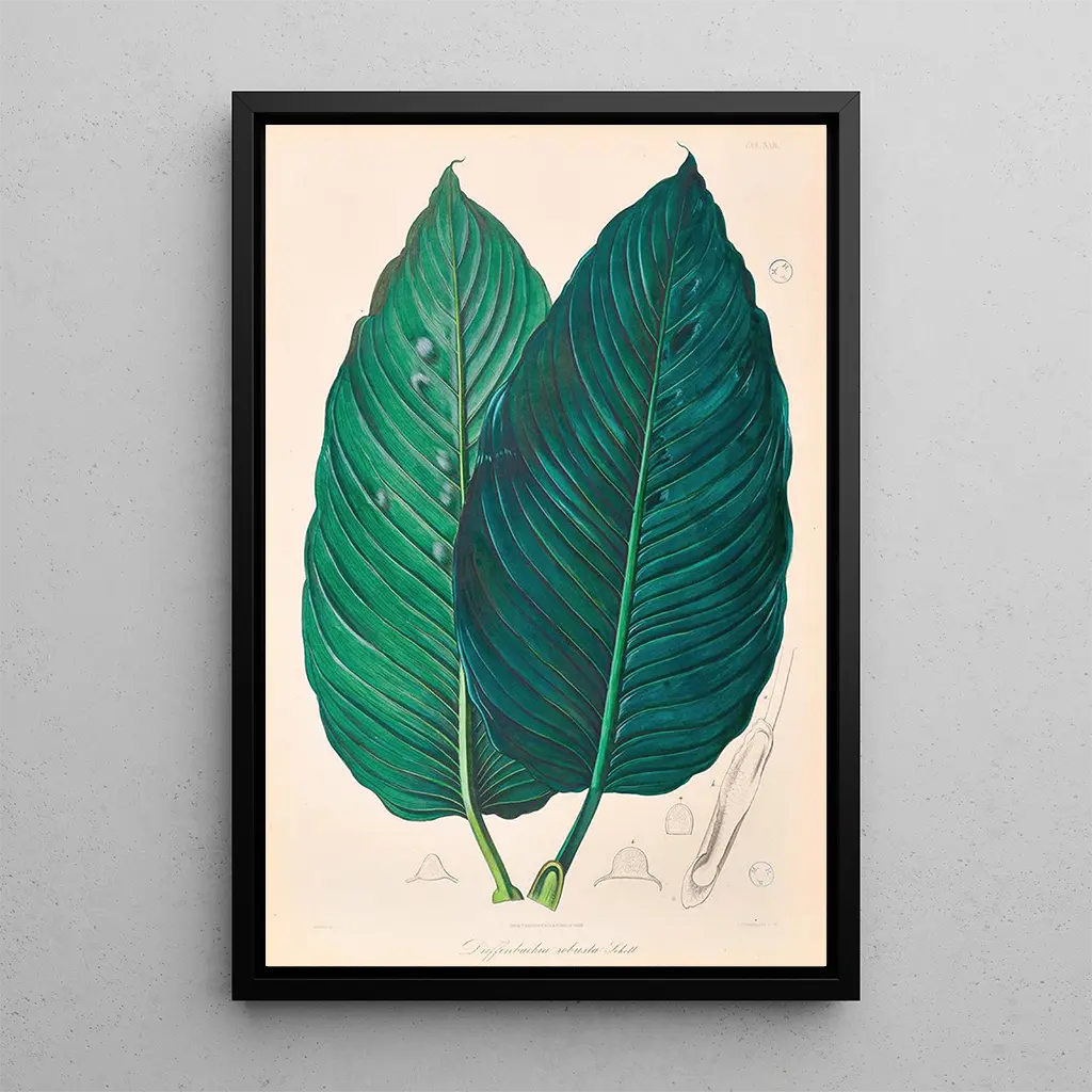 L'œuvre "Icones Aroidearum Pl22" av Heinrich Wilhelm Schott är en hyllning till den blomstrande rikedom. Denna botaniska illustration, utförd med en exceptionell noggrannhet, avslöjar former och färger som fängslar ögat. De strålande nyanserna, från frodiga gröna till djupa violetta, framkallar en känsla av friskhet och vitalitet. Tekniken med akvarell, använd med finess, gör det möjligt att återge ljuset och texturen hos växterna på ett nästan påtagligt sätt. Varje detalj, varje skugga, verkar berätta en historia och bjuder in betraktaren att utforska den fascinerande världen av arumväxter.