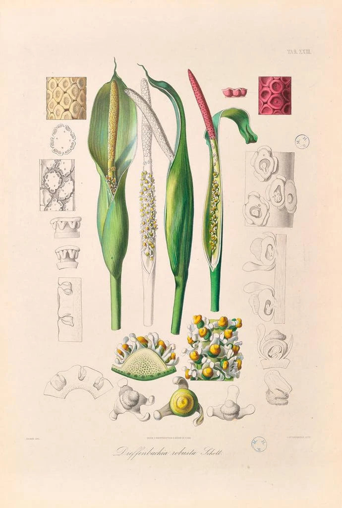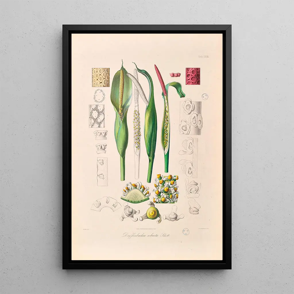 Konsttrycket av "Icones Aroidearum Pl23" är ett dekorativt föremål som kan berika alla utrymmen, vare sig det är ett vardagsrum, ett kontor eller ett sovrum. Dess utskriftskvalitet och färgprecision gör det till ett perfekt val för dem som vill tillföra ett naturinslag i sitt hem. Detta konsttryck, med sin obestridliga estetiska attraktion, fångar blickar och väcker nyfikenhet. Genom att integrera denna väggdekoration i din inredning erbjuder du inte bara ett konstverk, utan också en dialog om biodiversitet och skönheten i den växtliga världen. Det är ett förvärv som förenar kultur och inredning, perfekt för botanikkunniga och konstälskare.