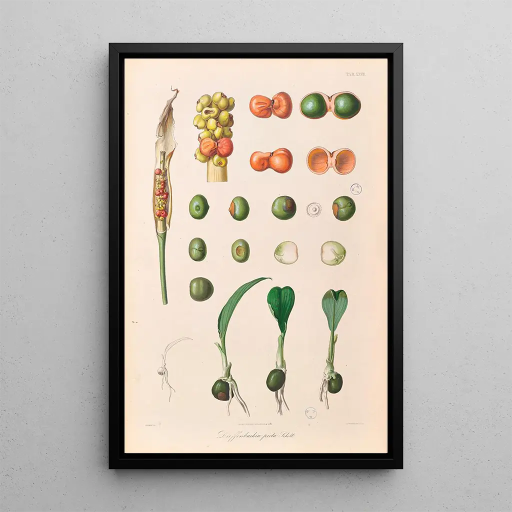 Konsttrycket av Icones Aroidearum Pl27 är ett dekorativt föremål som kan berika vilket utrymme som helst, vare sig det är ett vardagsrum, ett kontor eller ett sovrum. Dess utskriftskvalitet och färgprecision gör det till en fängslande tavla som fångar blick och väcker nyfikenhet. Genom att integrera denna duk i din inredning tillför du en touch av exotism och sofistikering, samtidigt som du hyllar naturens skönhet. Detta verk är inte bara ett estetiskt tillskott, utan också en källa till inspiration och reflektion över den biologiska mångfalden som omger oss.