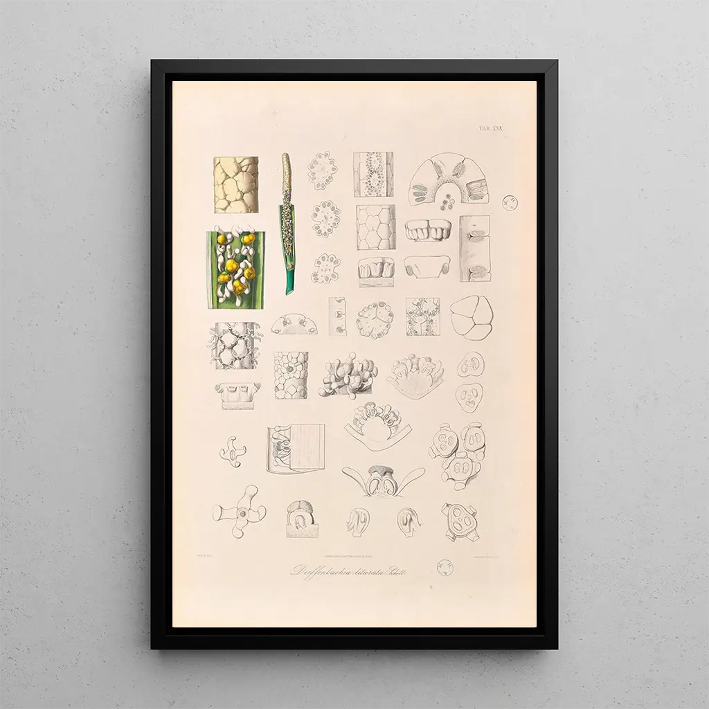"Icones Aroidearum Pl30" av Heinrich Wilhelm Schott är ett konsttryck som förflyttar betraktaren till en frodig värld av former och färger. Denna botaniska illustration framhäver de karakteristiska egenskaperna hos arumväxterna, med noggranna detaljer som avslöjar varje växts komplexitet. De rika och varierade nyanserna, från djupgrönt till strålande vita och lila, skapar en livfull och dynamisk atmosfär. Graveringstekniken, kombinerad med en skarp observationsförmåga, gör att Schott kan fånga essensen av dessa fascinerande växter och därigenom bjuda in till att utforska naturens skönhet.