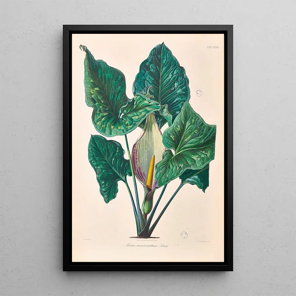 Konsttrycket av Icones Aroidearum Pl39 utgör ett perfekt dekorativt val för olika levande utrymmen, oavsett om det är ett vardagsrum, ett kontor eller ett sovrum. Dess utskriftskvalitet garanterar en enastående trohet mot de ursprungliga detaljerna, samtidigt som det tillför en touch av grönska och friskhet till ditt hem. Den estetiska dragningskraften hos denna väggbonad gör den till ett fängslande blickfång, som väcker beundran hos dina gäster. Genom att integrera detta konstverk i din inredning erbjuder du inte bara ett konstverk, utan också en hyllning till naturens skönhet, vilket berikar din dagliga miljö.