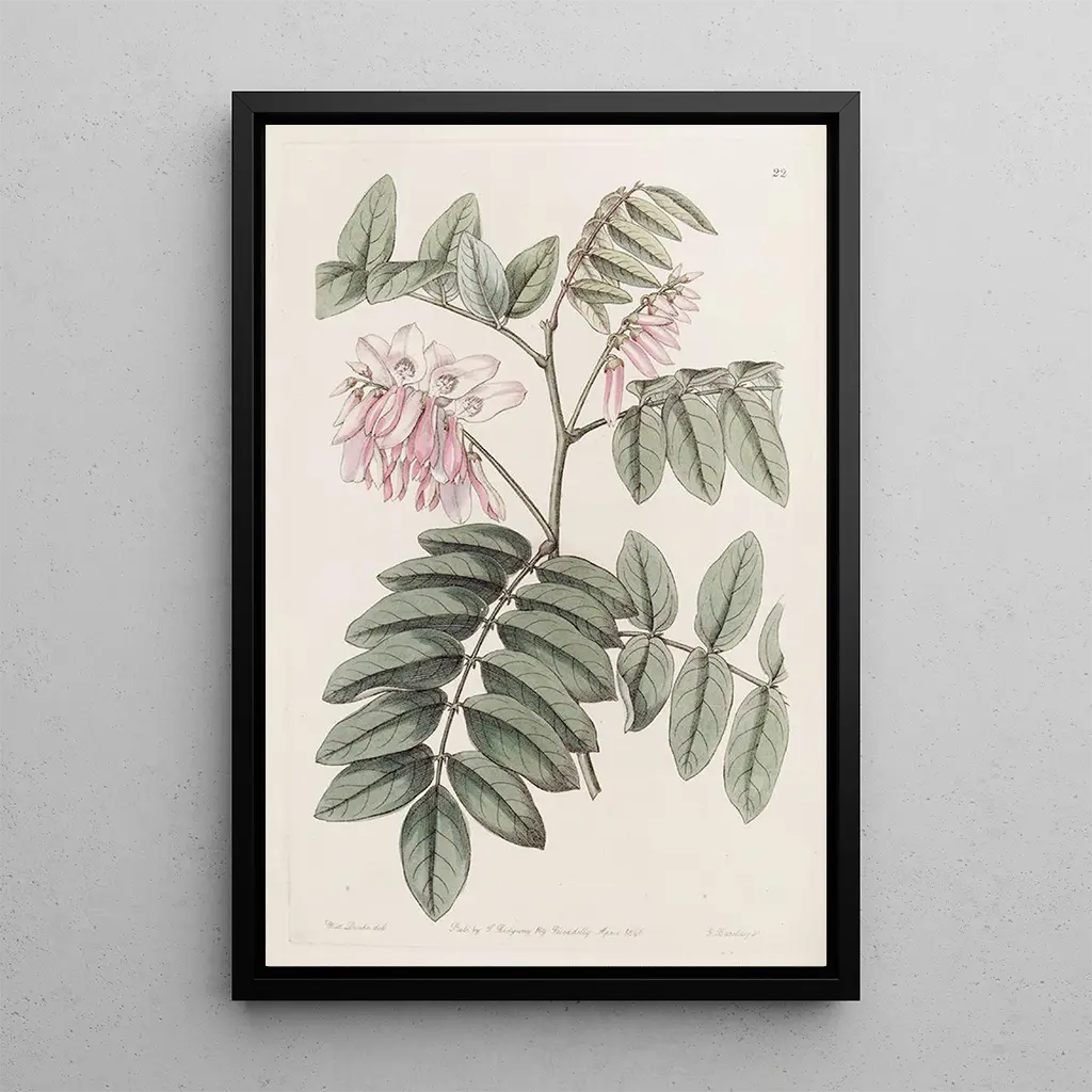 Dans cette konsttryck de L-indigo gracieux, Sydenham Edwards nous offre une vision captivante d'une plante aux teintes vibrantes. Les nuances d'indigo se mêlent harmonieusement, créant un effet visuel qui évoque la légèreté et la fluidité. La composition, soigneusement équilibrée, met en avant les formes délicates des feuilles et des fleurs, tout en laissant transparaître une atmosphère de sérénité. Chaque détail est rendu avec une précision qui témoigne du talent d'Edwards, invitant le spectateur à s'émerveiller devant la beauté de la nature.