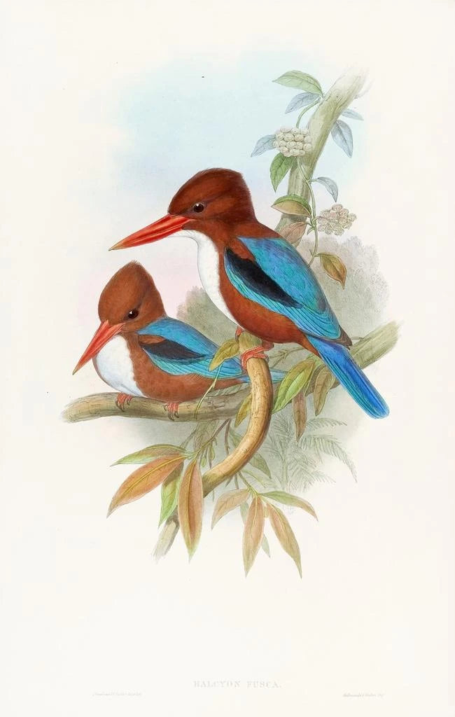 Konsttrycket av Martin-pêcheur indien väcker sinnena med sin glans och sin elegans. John Gould, genom sin oöverträffade talang, lyckas fånga själva essensen av denna fascinerande fågel. De livfulla färgerna, från koboltblå till flammande orange, blandas för att skapa en dynamisk komposition som framkallar vitaliteten hos tropiska floder. Verket utstrålar en atmosfär av lugn och rörelse, vilket inbjuder betraktaren att uppskatta naturens flyktiga skönhet. Varje detalj, från reflektioner på fjädrarna till ljusnyanser, vittnar om Goulds mästerskap inom konstnärlig fågelillustration.