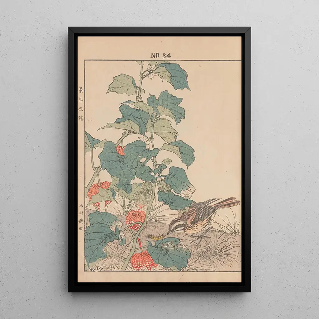 Keinen kach gafu Pl037 är ett konsttryck som fördjupar oss i en finstämd värld där naturen avslöjar sig med en anmärkningsvärt subtil elegans. Pastellfärger, från mjuka gröna till subtila rosa, skapar en lugnande, nästan meditativ atmosfär. Tekniken för ukiyo-e, som är typisk för japansk konst, möjliggör fångsten av blommornas och bladens lätthet, medan de noggranna detaljerna avslöjar konstnärens exceptionella hantverk. Varje element är omsorgsfullt arrangerat och inbjuder betraktaren till en förlängd reflektion över denna harmoniska scen.