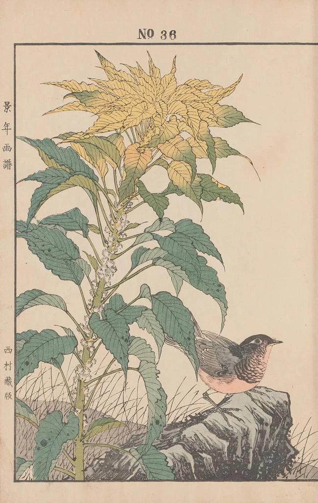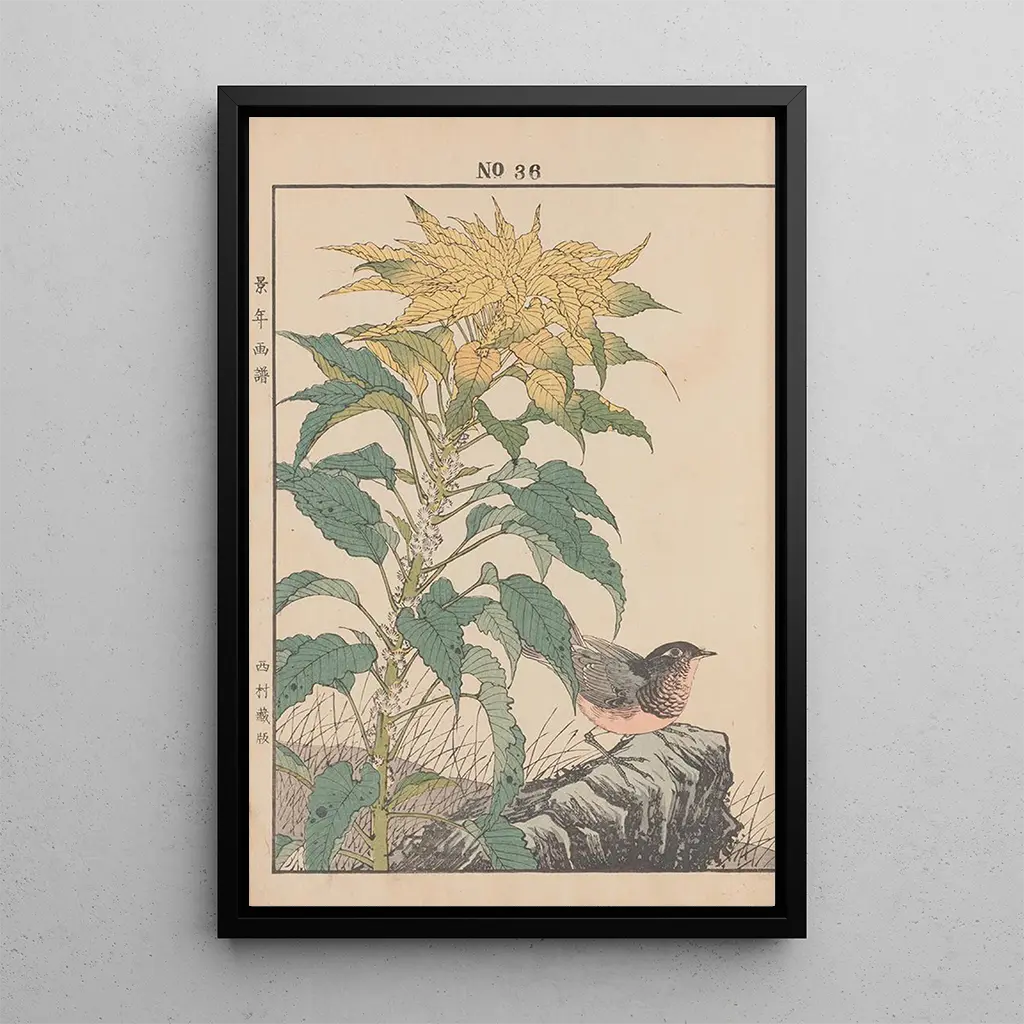 Konsttrycket av Keinen kach gafu Pl039 fördjupar oss i en värld där naturen lyfts fram med en otrolig känslighet. De mjuka färgerna och de noggranna detaljerna av blommor och fåglar skapar en lugnande, nästan meditativ atmosfär. Tekniken med ukiyo-e på papper, typisk för Edo-perioden, gör det möjligt för konstnären att fånga den flyktiga skönheten i japansk flora och fauna. Varje element tycks vibrera under betraktarens blick, inbjudande till en tyst och respektfull kontemplation av naturen.