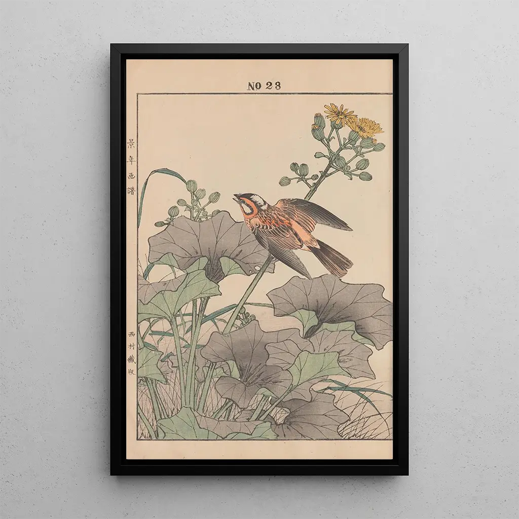 Konsttrycket av Keinen kach gafu Pl147 fördjupar oss i en finstämd värld där skönheten hos blommor och fåglar smälter samman i harmoni. Pastellfärger, mjuka och lugnande, skapar en fridfull atmosfär, medan den japanska träsnittstekniken, med sina flytande och precisa linjer, ger liv åt varje detalj. Blomsterornamenten, typiska för japansk konst, framkallar en tyst betraktelse och inbjuder betraktaren att stanna upp och uppskatta naturens skörhet. Denna tavla, en sann hyllning till den flyktiga skönheten, påminner oss om vikten av att njuta av livets flyktiga ögonblick.
