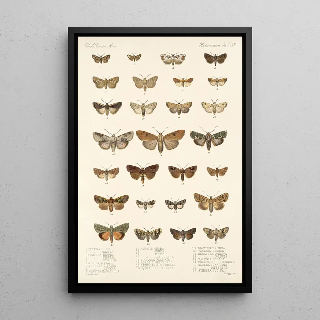 L'œuvre "Insecta Lepidoptera Heterocera Pl 027" av Frederick DuCane Godman är en visuell hyllning till rikedom och mångfald i fjärilarnas värld. Med livfulla färger som sträcker sig från klara nyanser till mer subtila toner, drar detta konsttryck till sig uppmärksamheten och inbjuder till utforskning. Akvarelltekniken, som behärskas av konstnären, gör det möjligt att återge fjärilarnas ömtålighet och mönster, vilket skapar en atmosfär som är både levande och poetisk. Varje detalj, varje nyans, verkar fånga essensen av dessa flyktiga varelser och erbjuder ett fönster till naturens sköra skönhet.
