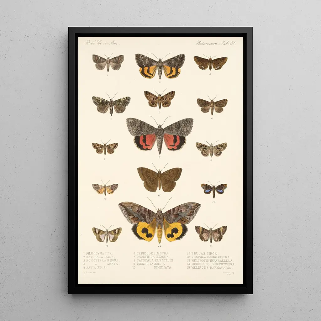 Konsttrycket av målningen Insecta Lepidoptera Heterocera Pl 031 utgör ett perfekt dekorativt val för olika utrymmen, oavsett om det är i ett vardagsrum, ett kontor eller ett sovrum. Dess utskriftskvalitet och färgåtergivning gör det till ett fängslande verk som kan höja atmosfären i ett rum. Den estetiska attraktionen hos detta konsttryck ligger i dess balans mellan vetenskap och konst, och ger en touch av elegans och nyfikenhet. Upphängd på väggen väcker den samtal och inbjuder till att utforska den fascinerande världen av insekter, samtidigt som den tillför en sofistikerad prägel till din inredning.