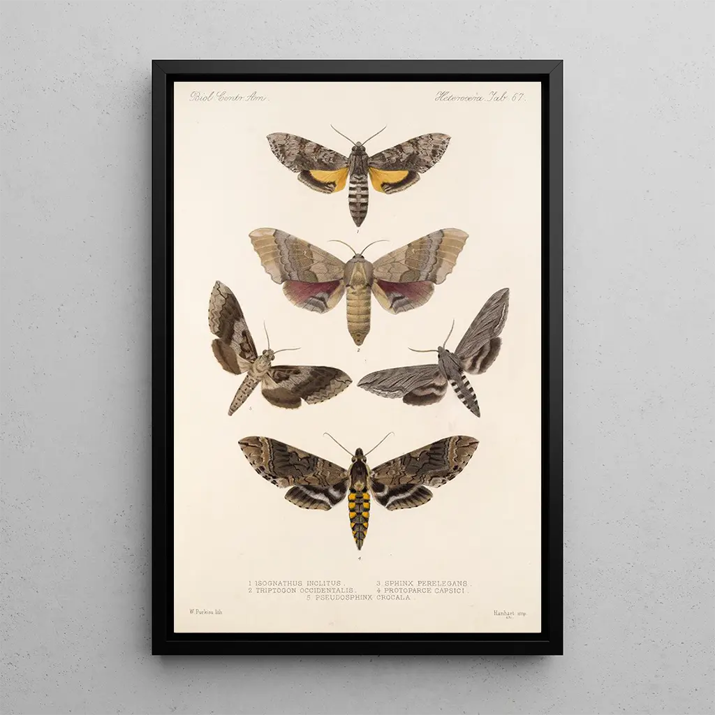 Konsttrycket Insecta Lepidoptera Heterocera Pl 067 framställs som ett verkligt naturalistiskt konstverk, som lyfter fram fjärilarnas prakt. De livfulla färgerna och de delikata mönstren på denna målning fångar uppmärksamheten och inbjuder till förundran. Varje detalj är noggrant återgiven, från vingarnas nervtrådar till de subtila nyanserna i färgskalan, vilket skapar en nästan magisk atmosfär. Godmans graveringsteknik fångar lättheten och elegansen hos dessa varelser, och ger en inblick i deras flyktiga skönhet. Denna tavla är en inbjudan att uppskatta mångfalden och komplexiteten i den naturliga världen, en hyllning till livets skörhet.