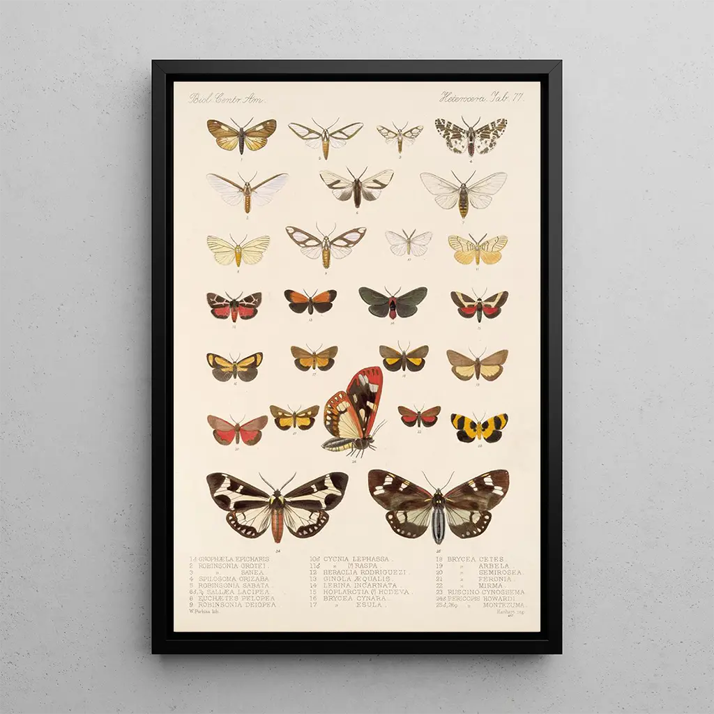 Konsttrycket Insekta Lepidoptera Heterocera Pl 077 inbjuder till att fördjupa sig i en delikat och färgstark värld. Detta verk, utfört med en anmärkningsvärt precision, lyfter fram nattfjärilar och fångar mångfalden av former och nyanser. De livfulla färgerna, från klara nyanser till mörkare toner, skapar en atmosfär som är både livfull och mystisk. Tekniken med naturalistisk illustration hyllar naturens skönhet samtidigt som den erbjuder en detaljerad och vetenskaplig bild av dessa fascinerande insekter.