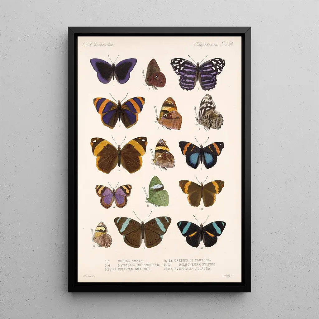"Insecta Lepidoptera Rhopalocera Pl 024" av Frederick DuCane Godman är ett konsttryck som fångar själva essensen av fjärilar i all sin prakt. Canvastavlan visar en mängd olika arter, var och en illustrerad med noggrann precision och livfulla färger som framkallar lätthet och grace hos dessa varelser. Akvarelltekniken, som används med bravur, ger hela verket en finstämd och poetisk atmosfär, där varje detalj tycks vibrera av liv. Detta konsttryck inbjuder till förundran och eftertanke, och avslöjar magin i den naturliga världen.