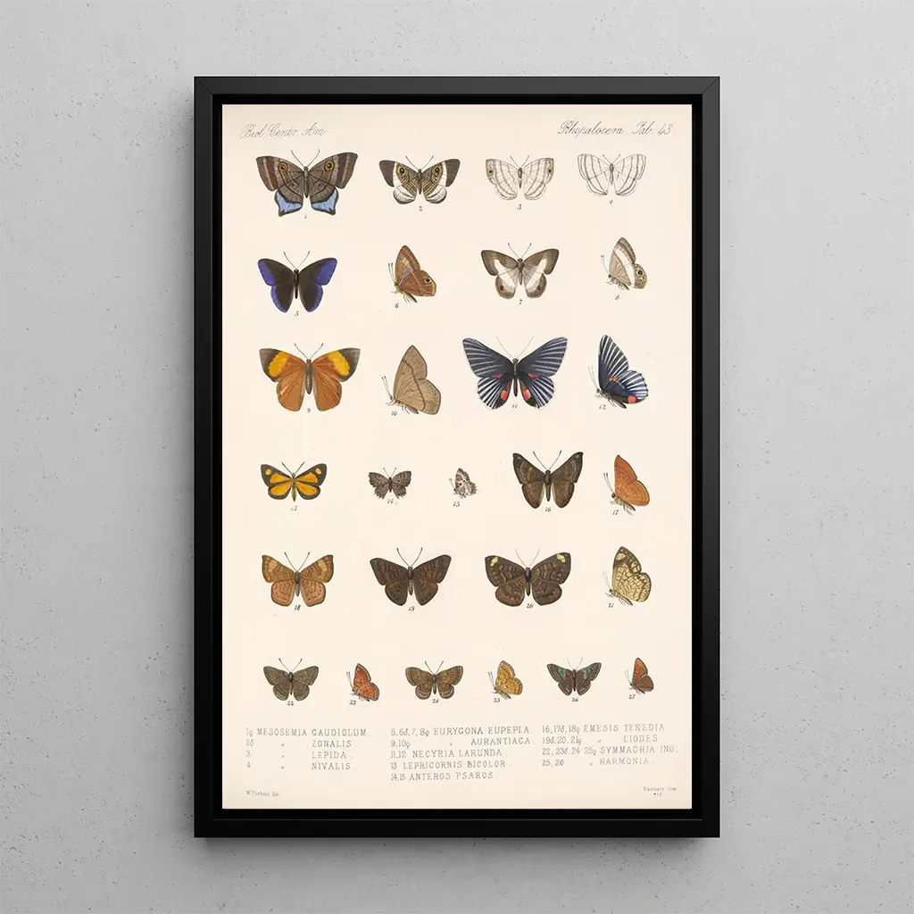 Konsttrycket Insecta Lepidoptera Rhopalocera Pl 044 avslöjar fjärilarnas prakt genom en livfull och detaljerad illustration. Varje nyans av färg, från strålande nyanser till delikata mönster, är noggrant återgiven, vilket ger en immersiv upplevelse av dessa fascinerande insekter. Atmosfären i verket, både vetenskaplig och konstnärlig, inbjuder till en visuell utforskning av naturens under. Tekniken som används av Godman, som kombinerar akvarell och gravyr, fångar fjärilarnas lätthet och elegans, vilket gör detta konsttryck till ett verkligt mästerverk att beundra.