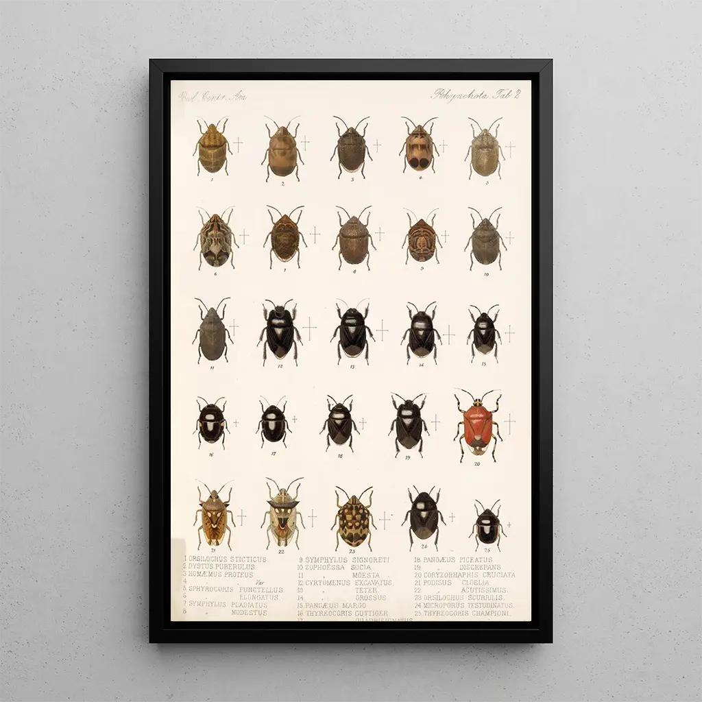 Konsttrycket av "Insecta Rhynchota Hemiptera Heteroptera Pl 02" är ett perfekt dekorativt val för olika utrymmen, oavsett om det är ett vardagsrum, ett kontor eller ett sovrum. Dess förfinade estetik och de fängslande detaljerna gör det till en tavla som väcker nyfikenhet och samtal. Kvaliteten på trycket garanterar en enastående trohet mot färger och detaljer i originalverket, vilket ger en berikande visuell upplevelse. Genom att integrera detta konsttryck i din inredning tillför du en touch av elegans och kultur, samtidigt som du hyllar naturens skönhet och vetenskapen – en verklig tillgång för alla konst- och biologifantaster.