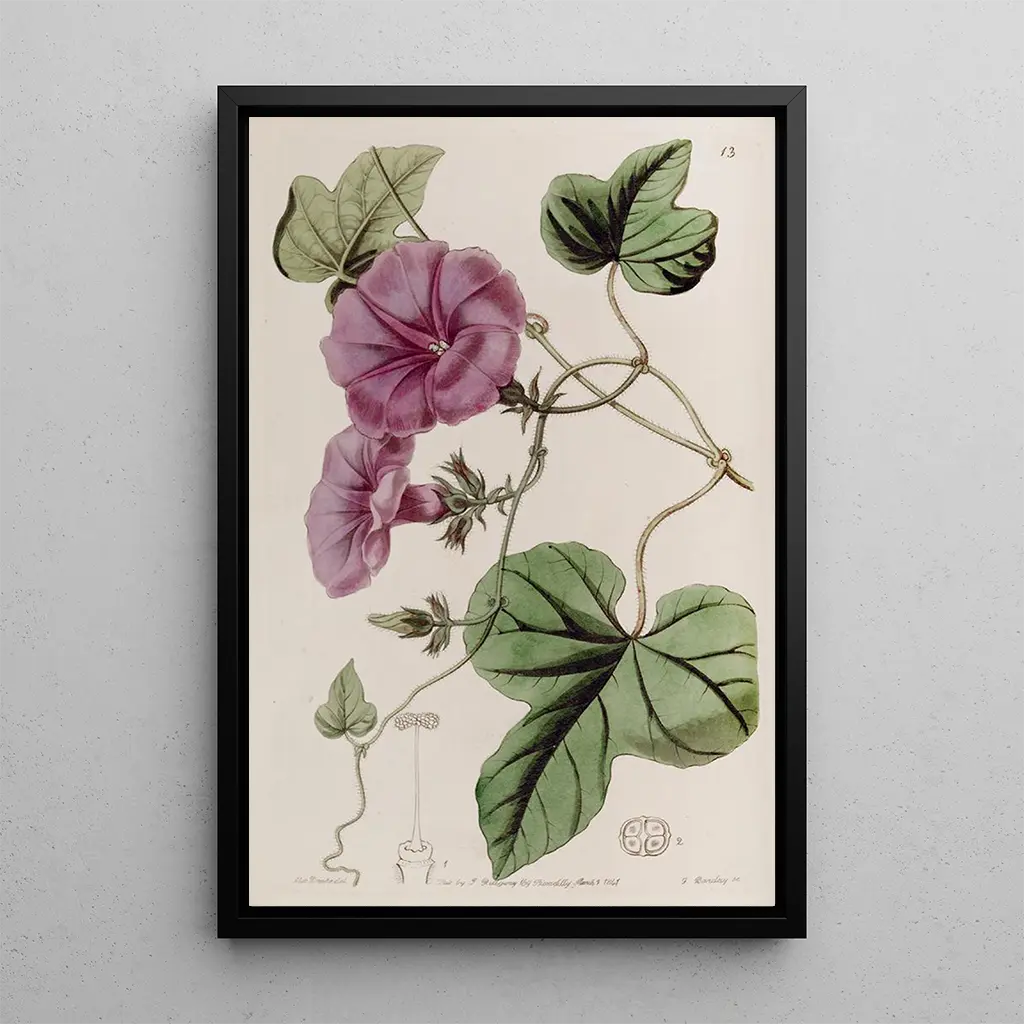 L’œuvre "Ipomée à feuilles de figuier" av Sydenham Edwards är en verklig hyllning till botanisk skönhet. Detta konsttryck utmärker sig genom sina livfulla färger och sin noggranna detaljrikedom. Skiftningarna av grönt och lila blandas harmoniskt och skapar en atmosfär som är både lugnande och dynamisk. Akvarelltekniken, använd med en anmärkningsvärt fin känsla, ger liv åt varje blomblad och varje blad, och bjuder in betraktaren att fördjupa sig i en förtrollande blomstervärld. Denna tavla framkallar känslan av en promenad i en frodig trädgård, där varje växt berättar en historia.