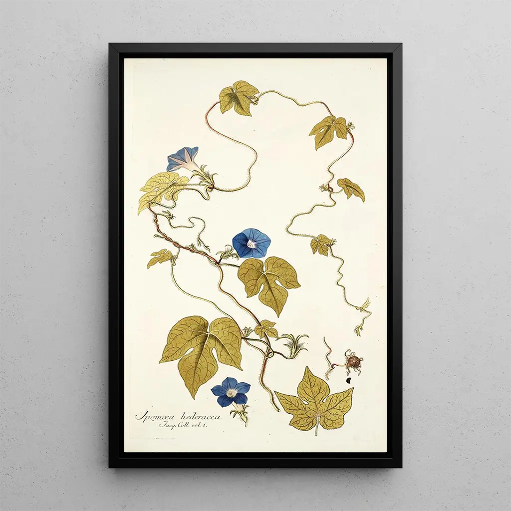L'œuvre "Ipomoea hederacea" av Nikolaus Joseph Freiherr von Jacquin tar oss med till en rik och livfull botanisk värld. Detta konsttryck, som fångar den delikata skönheten hos den klättrande växten, utmärker sig med sina ljusa färger och harmoniska komposition. Skiftningarna av grönt, lila och vitt flätar samman för att skapa en levande och glad atmosfär. Konstnärens teknik, som kombinerar vetenskaplig precision med konstnärlig känslighet, inbjuder oss att beundra naturens komplexitet samtidigt som den ger en poetisk syn på blommorna. Varje petal tycks vibrera under ljuset och avslöjar den flyktiga skönheten hos denna växt.