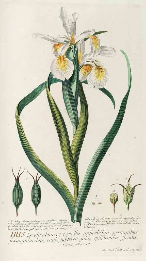 Georg Dionysius Ehret, botanisk illustratör från 1700-talet, satte sitt prägel på sin tid med sina precisa och konstnärliga skildringar av flora. Hans arbete ingår i en kontext där botanik upplever en betydande tillväxt, med konstnärer och vetenskapsmän som strävar efter att dokumentera artdiversiteten. Påverkad av tänkare som Linné, lyckades Ehret kombinera vetenskaplig noggrannhet med estetisk känsla, vilket gör honom till en pionjär inom botanisk illustration. "Iris" är ett perfekt exempel på hans talang, som förenar visuell skönhet med botanisk precision.