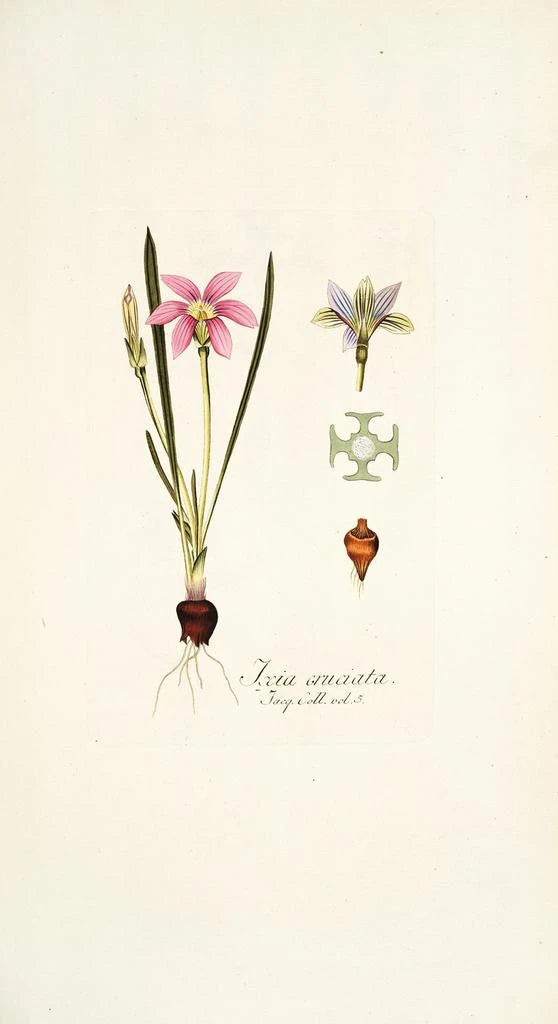 Nikolaus Joseph Freiherr von Jacquin, botanist och konstnär från 1700-talet, spelade en avgörande roll inom botanisk illustration. Utbildad vid Wiens universitet, påverkades han av tidens vetenskapliga upptäckter och reste till Sydamerika, där han samlade många växtarter. Hans arbete utmärks av ett stort detaljfokus och en vetenskaplig metod, samtidigt som det behåller en konstnärlig dimension. "Ixia cruciata" vittnar om hans skicklighet att förena estetik och precision, vilket gör honom till en framstående figur inom botanisk konst från sin tid. Hans verk fortsätter att inspirera konst- och botanikkännare.