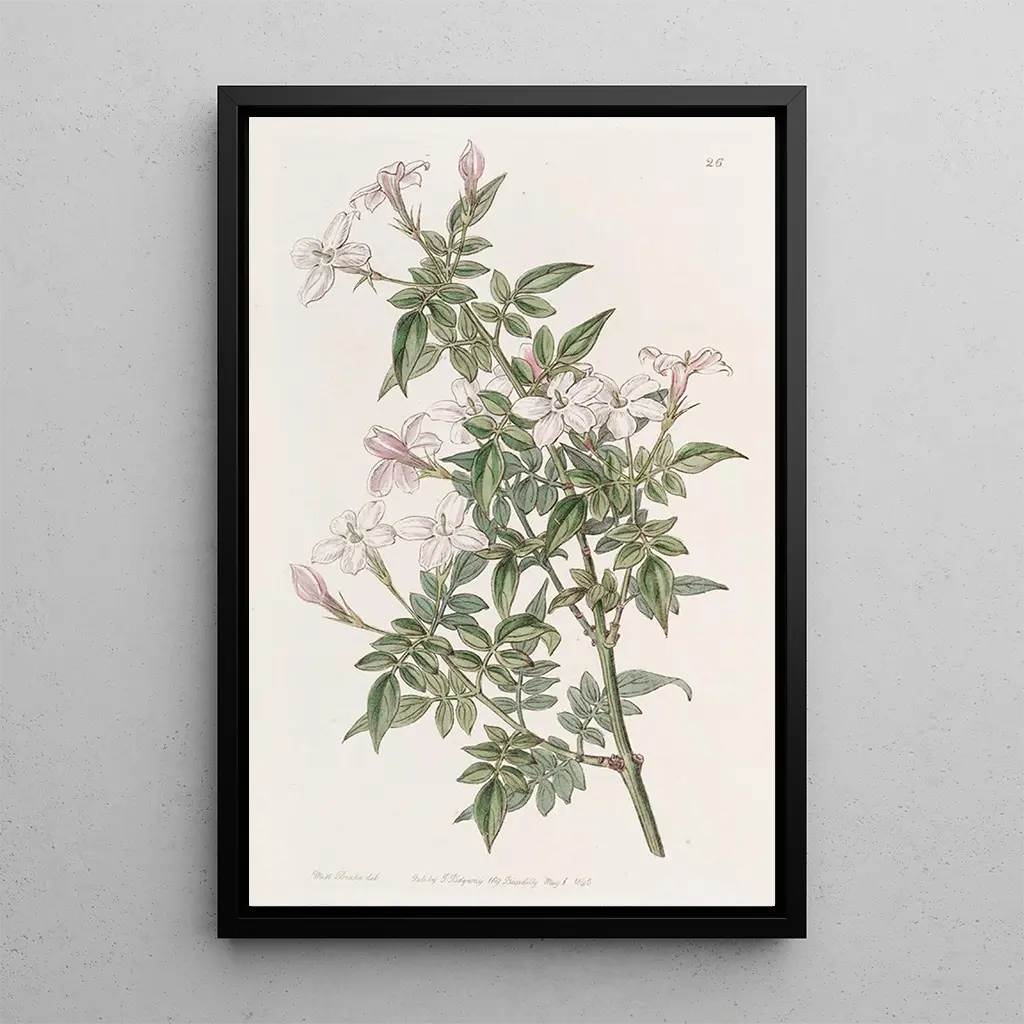 Konsttrycket "Jasmin släktet" av Sydenham Edwards framkallar en blomstrande florauniversum, där nyanser av grönt och vitt blandas harmoniskt. Den delikata kompositionen av detta konsttryck lyfter fram den flyktiga skönheten hos blommorna, fångar ljuset på ett nästan levande sätt. De minutiösa detaljerna i kronblad och blad vittnar om en noggrann teknik, som avslöjar konstnärens passion för botanik. Atmosfären som avtecknar sig i denna tavla inbjuder till en lugnande eftertanke, där varje element verkar berätta en historia om natur och frid.