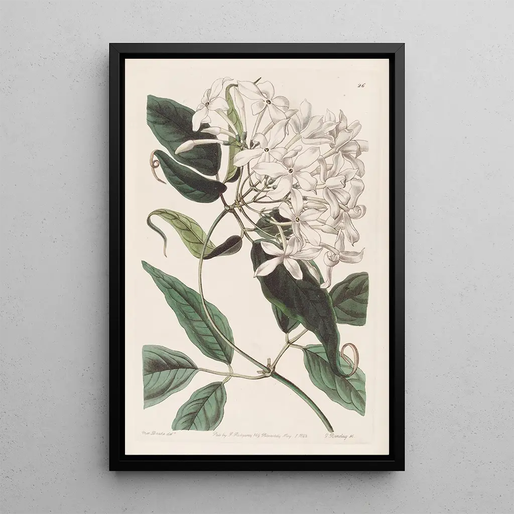 Det konsttryck Jasmin à feuilles de tilleul, signerat av Sydenham Edwards, framkallar en blomstrande sötma fylld av lugn. De mjuka nyanserna av vitt och grönt flätar samman sig och skapar en lätt och luftig atmosfär. Den precisa återgivningen av bladen och blommorna, med noggrann uppmärksamhet på detaljer, vittnar om Edwards expertis inom botanisk illustration. Varje element i detta verk tycks andas trädgårdens friskhet och bjuder in betraktaren att fördjupa sig i en värld av naturlig skönhet. Denna målning är en sann hyllning till flora, som fångar essensen av jasmin.